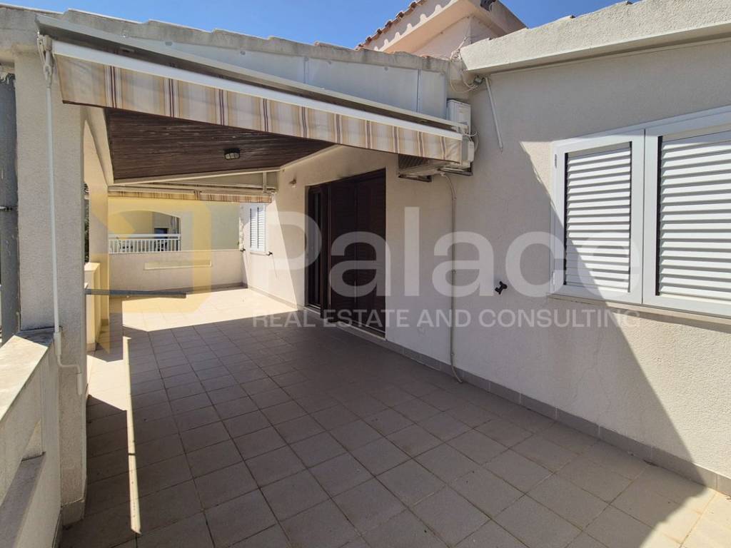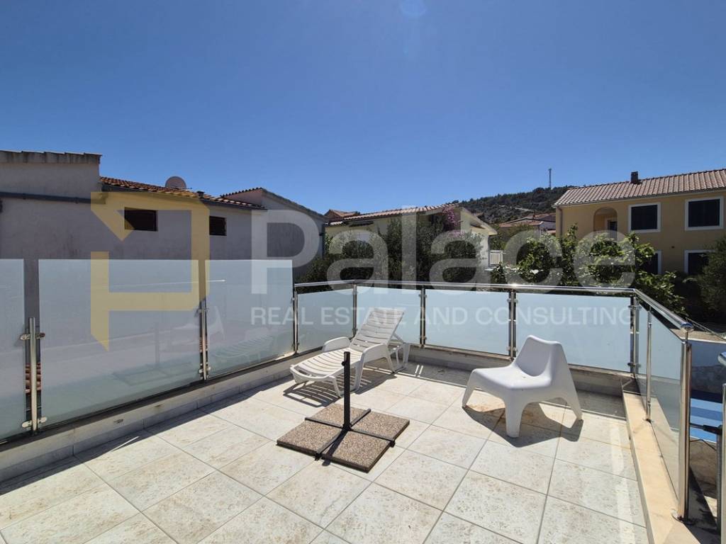 Vanjsko stubište vodi do druge etaže koju čini prostrana natkrivena terasa, dvije spavaće sobe od kojih jedna ima izravan ulaz u kupaonu, kuhinja s blagavaonom te dnevni boravak.