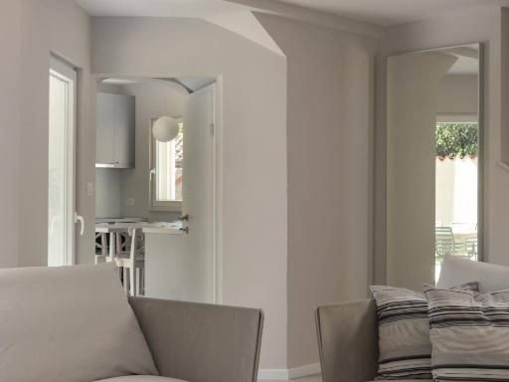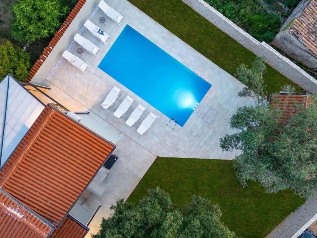 Kuća se proteže na dvije etaže ukupna površina 165 m2. U prizemlju se nalazi prekrasni dnevnog boravak sa kuhinjom i blagovaonicom, jedna spavaća soba, kupaonica i ostava. Iz dnevnog boravka se izlazi na natkrivenu terasu sa koje se pristupa ljetnoj kuhinji sa kaminom, grijanom bazenu s protustrujnim plivanjem, sunčalištu i prekrasno uređenoj okućnici.