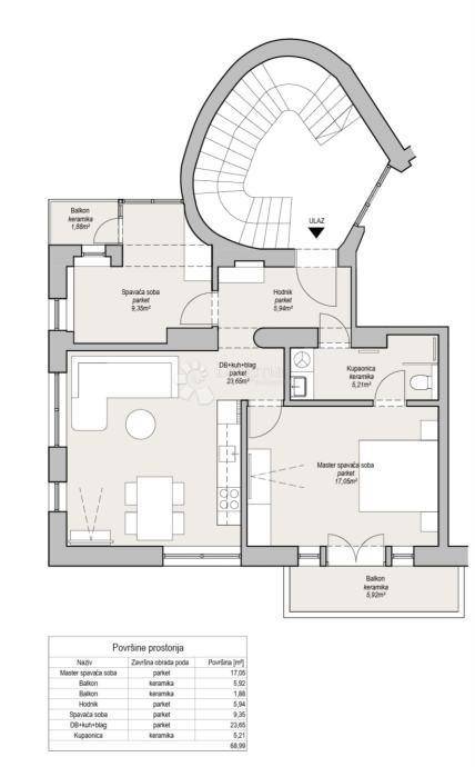 Stan se sastoji se od open-space dnevnog boravka, kuhinje i blagovaonice, dvije spavaće sobe, moderne kupaonice s walk-in tušem i WC-om te ulaznog hodnika koji povezuje sve prostorije. Iz glavne spavaće sobe izlazi se na balkon orijentiran prema ulici - istočna strana, dok druga soba ima izlaz na balkon okrenut prema mirnoj dvorišnoj strani - jugozapad, a može se urediti kao dodatna spavaća soba ili radni prostor, ovisno o potrebama najmoprimca.