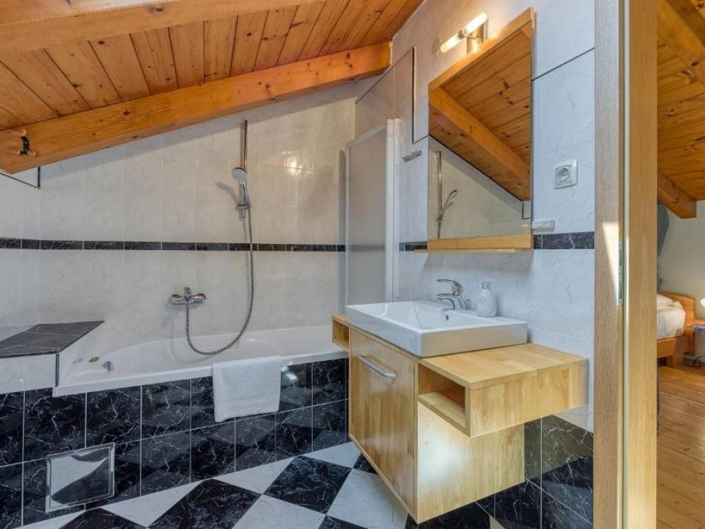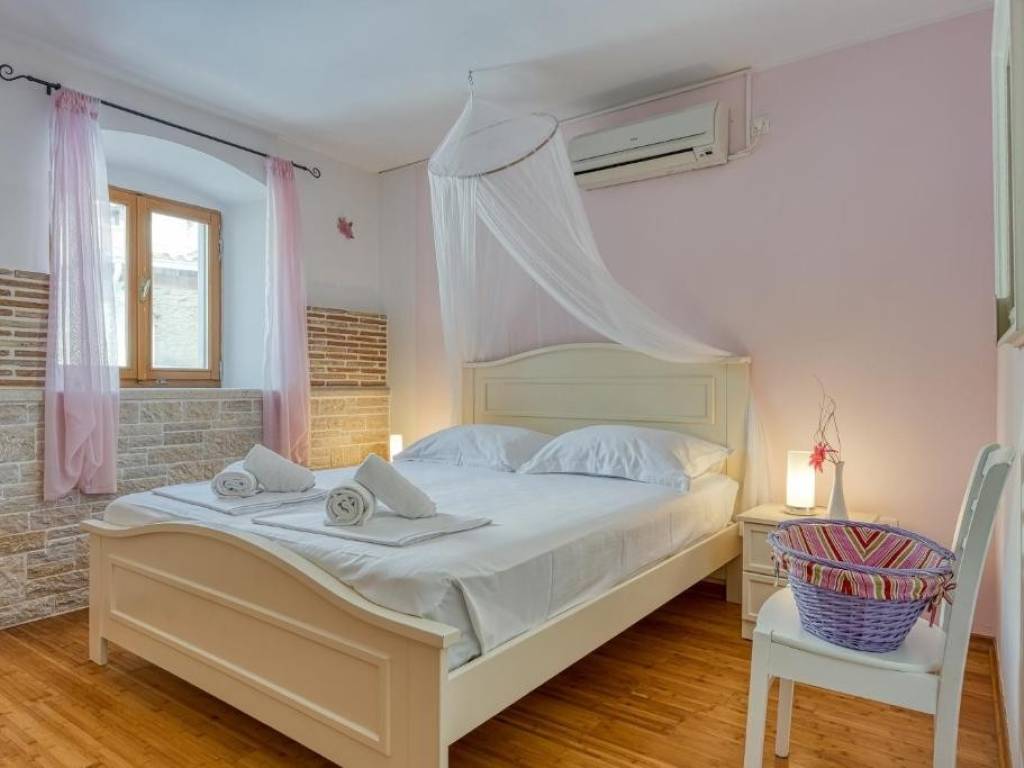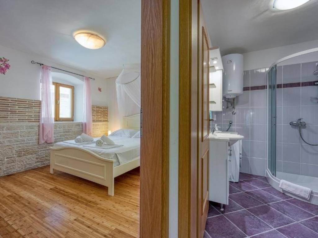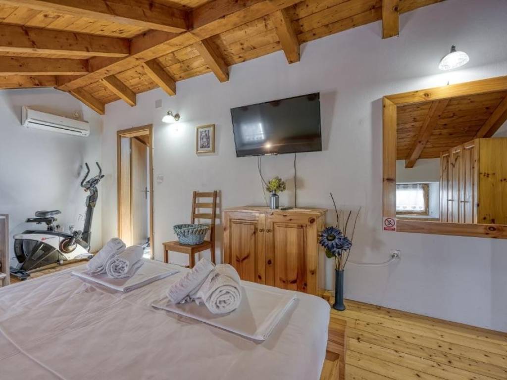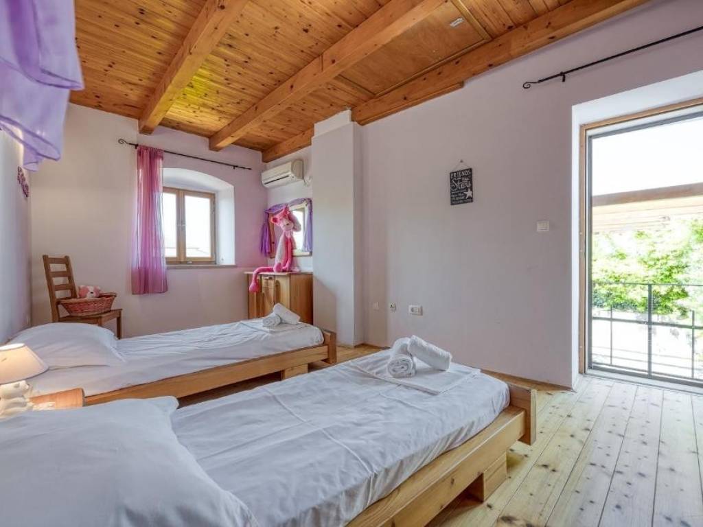 Na prizemnoj etaži nalazi se open space dnevni boravak s kuhinjom i blagovaonom , jedna velika spavaća soba te kupaona dok se unuratnjim stepeništem penjemo na kat gdje se nalaze još tri spavaće sobe od kojih je jedna s vlastitom kupaonom te još jedna ekstra kupaona za druge dvije sobe.. Svaka soba ima klima uređaj , a u zimskim danima možete se zagrijati i kraj kamina .