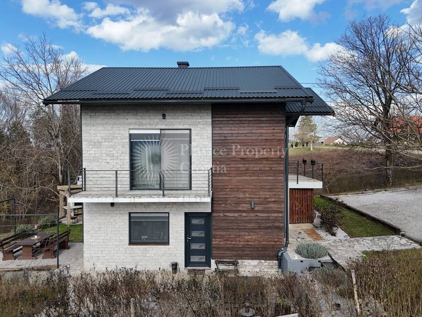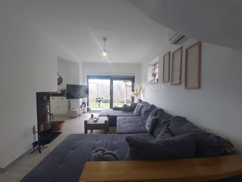 Vanjski dio kuće ukrašen je drvom i ukrasnim kamenim elementima, što nekretnini daje prirodan i rustikalni izgled koji se dobro uklapa u okolni krajolik.