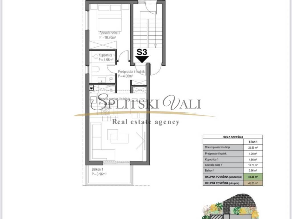 Ukupna površina unutrašnjeg prostora iznosi 41,85 + južni balkon 3,96. Ukupna površina iznosi 45,81 ( obračunski 43,83).