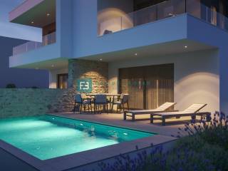 Dvojni objekt u novogradnji nalazi se u mirnom i uređenom dijelu grada, okružen obiteljskim kućama. Nekretnina se smjestila u slijepoj ulici što osigurava mir i privatnost. Na udaljenosti od 1500 m od centra grada i 1800 m od plaže, omogućuje da se udaljite od gradske gužve i stresa, a ipak ste samo nekoliko minuta udaljeni od svih pogodnosti koje Vodice nude. Prednost ove nekretnine je dvoetažni raspored koji pruža dodatnu privatnost i čini životni prostor funkcionalnijim i ugodnijim. Osim toga, svaka jedinica dolazi s vlastitim dvorištem, bazenom te po dva parkirna mjesta. Nekretnina je pogodna za boravak tijekom cijele kalendarske godine, ali ima veliki potencijal za turističko iznajmljivanje.