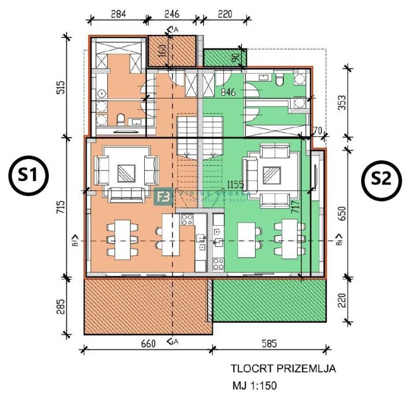 Kuća S2 korisne površine 143,39 m2 sastoji se od dvije etaže: prizemlje + 1. kat. U prizemlju kuće nalazi se ulaz, hodnik, spremište, WC, open space kuhinja s blagovaonicom i dnevnim boravkom koji ima izlaz na prostranu terasu površine 12,76 m2, vrt površine cca 100 m2, te lijepi bazen površine 18,90 m2. Unutarnjim stubištem dolazi se na 1. kat gdje su tri spavaće sobe, dvije kupaonice i dva balkona. Kući pripada dva parkirna mjesta.
