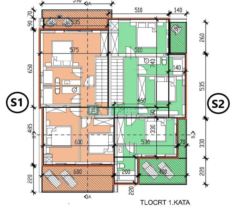 Kuća S1 korisne površine 159,13 m2 sastoji se od dvije etaže: prizemlje + 1. kat. U prizemlju kuće nalazi se ulaz, hodnik, spremište, WC, open space kuhinja s blagovaonicom i dnevnim boravkom koji ima izlaz na prostranu terasu površine 18,04 m2, vrt površine cca 100 m2, te lijepi bazen površine 18,90 m2. Unutarnjim stubištem dolazi se na 1. kat gdje su tri spavaće sobe, dvije kupaonice i dva balkona. Kući pripada dva parkirna mjesta. Cijena iznosi 404.000 €.