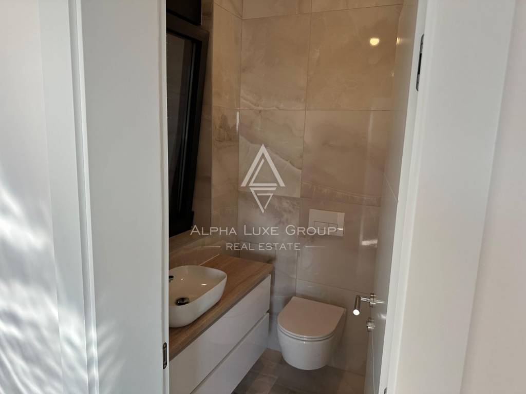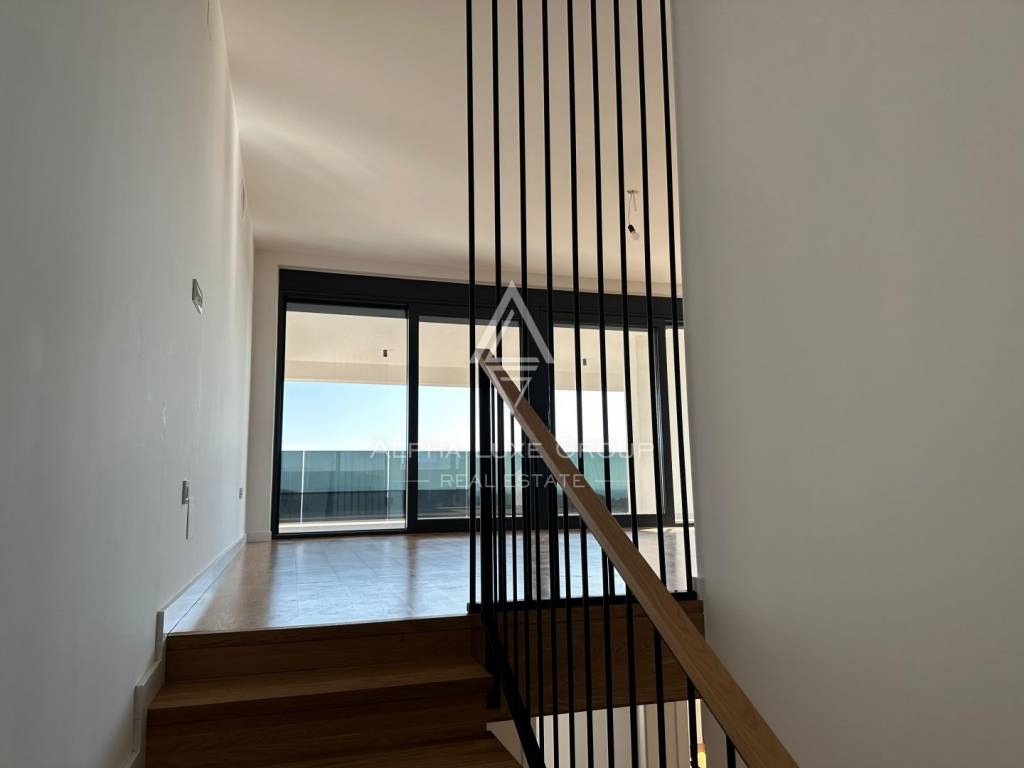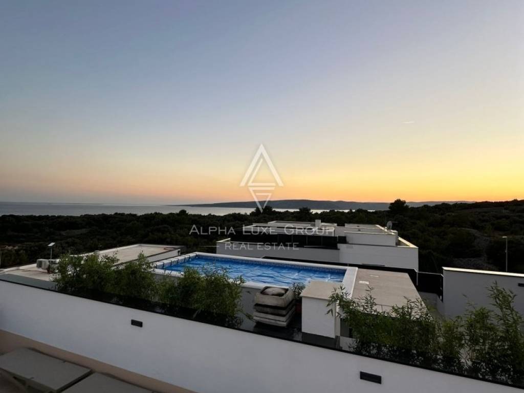 A new building for sale on the island of Krk. The apartment has a total of 167 m2. The closed part is about 123 m2 + terrace and 2 parking spaces. The apartment consists of: 3 bedrooms, hallway, 2 bathrooms and 1 toilet, living room with kitchen and large terrace. The apartment is two-storey and has access to the upper floor, i.e. to the roof with a swimming pool. The building is finished and has two floors.