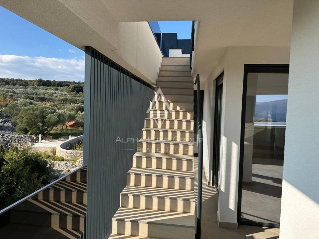 Prodaje se novogradnja na otoku Krku. Stan ima ukupno 167 m2. Zatvoreni dio iznosi oko 123 m2+terasa i 2 parkirna mjesta. Stan se sastoji od: 3 sobe, hodnika, 2 kupaonice i 1 wc-a, dnevnog boravka sa kuhinjom i velikom terasom. Stan je dvoetažni i ima izlaz na gornji kat, odnosno na krov sa bazenom. Zgrada je gotova i ima dva kata.