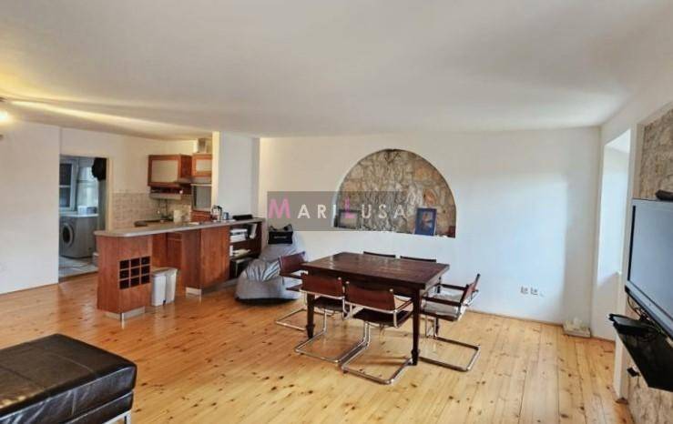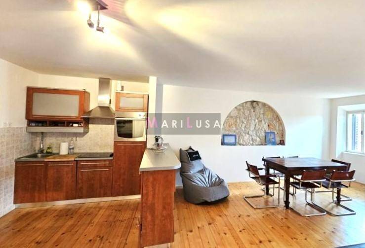 Stan se nalazi u samom srcu grada, na drugom katu zgrade starije gradnje.Stan se sastoji od ulaznog hodnika, prostranog open-space dnevnog boravka-blagovaone-kuhinje,dvije spavaće sobe, kupaonice s tuš kabinom, ostave i pripadajućeg spremišta u podrumu zgrade.