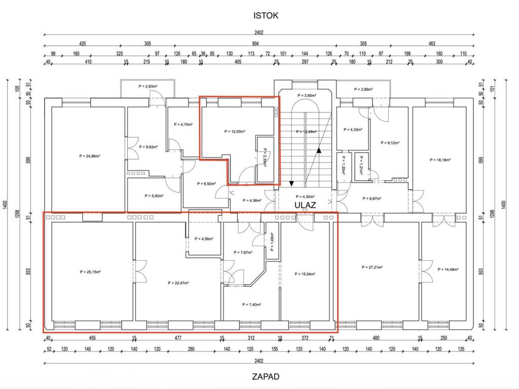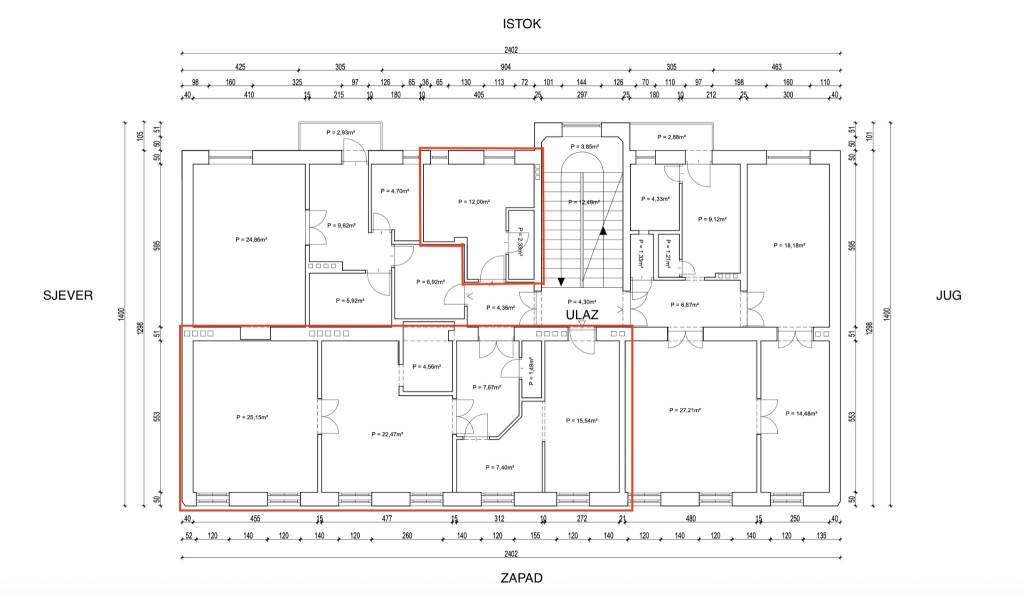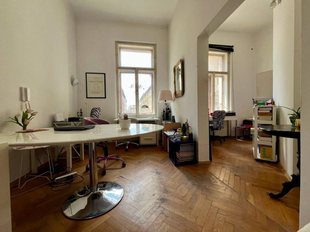 Prodajemo prostran građanski četverosobni stan visokih stropova te pripadajući poslovni prostor površine cca. 15m2. Nekretnine se nalaze jedna pored druge, na 1. katu stambene zgrade u Palmotićevoj ulici. Stan se sastoji od 4 sobe, blagovaonice s kuhinjom, 2 kupaonice s WC-ima, te zasebnog WC-a. Stanu pripada i šupa u podrumu, te DVA VANJSKA PARKING MJESTA u dvorištu zgrade.