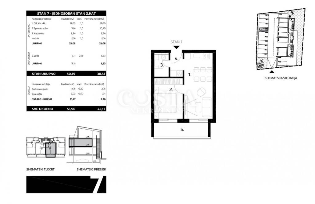 Prodaje se stan u izgradnji na Skročinima u Zadru. Stan stambene površine 33,08 m2 nalazi se na drugom katu zgrade s 10 jedinica. Sastoji se od jedne spavaće sobe, kupaonice, dnevnog boravka, kuhinje i blagovaone, hodnika, te lođe od dodatnih 7,11 m2. Stanu pripadaju jedno parkirno mjesto i spremište, pa je ukupna korisna površina stana zajedno sa svim pripacima 55,96 m2 (K.V. 42,17 m2).