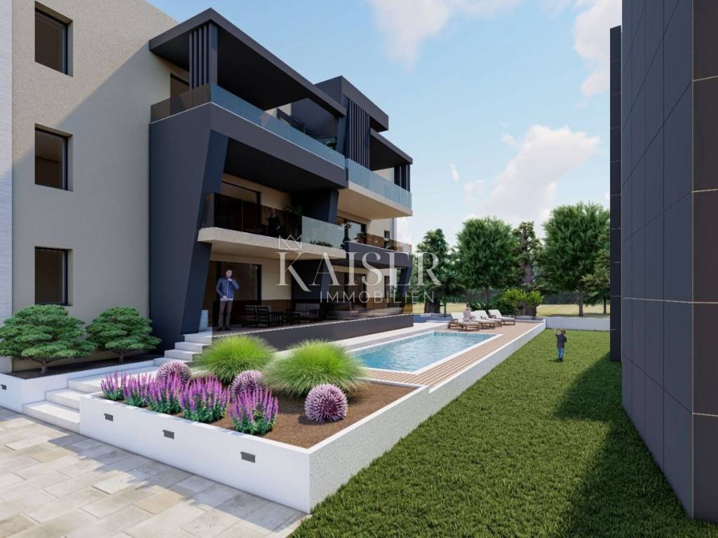 Kaiser Immobilien predstavlja: Prostrani trosobni stan na 1. katu s bazenom – Sukošan, 150 m od mora