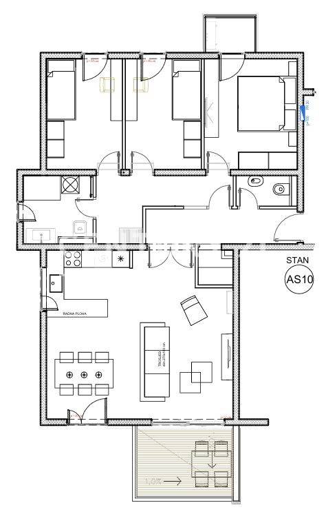 Stan se sastoji od ulaznog prostora, kuhinje s blagovaonicom i dnevnim boravkom, predsoblja, tri spavaće sobe, ostave, kupaonice i dodatnog WC-a.