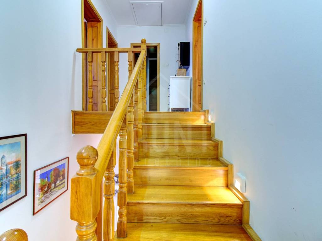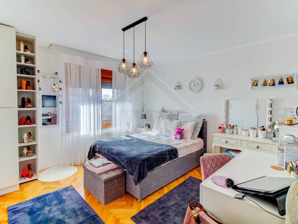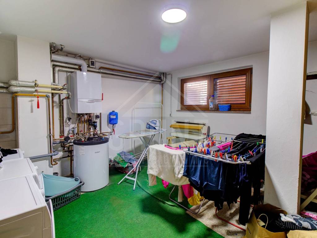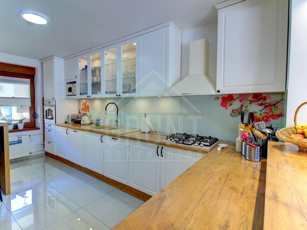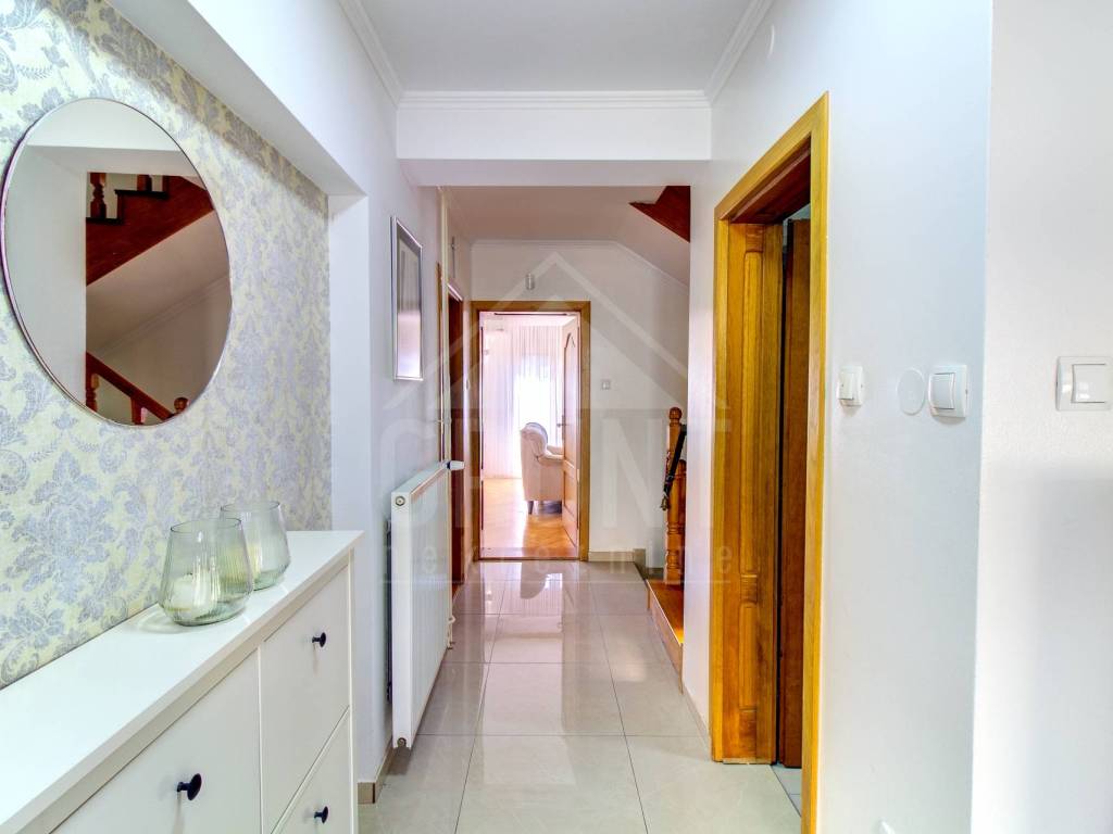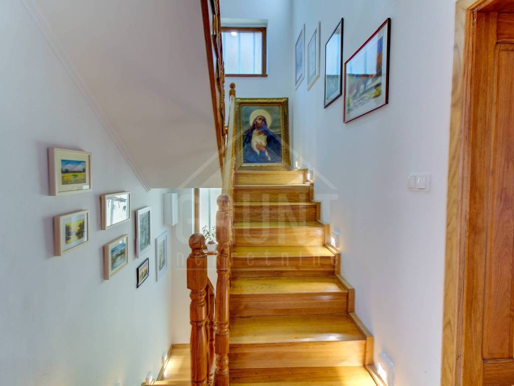 Kuća je brutto stambene površine od cca. 400 m2, a sastoji se od podruma ispod cijele kuće sa garažom, prizemlja, kata te potkrovlja (svaka etaža je cca. 100 m2 brutto). U prizemlju se nalazi predsoblje sa garderobom iz kojega se ulazi veliki dnevni boravak sa blagovaonicom i kuhinjom koji ima izlaz na terasu te gostinjski toalet. Drvena stubišta povezuju sve četiri etaže. Na katu se nalazi glavna spavaća soba sa pripojenom vlastitom kupaonicom i walk-in ormarom, dvije spavaće sobe i kupaonica. U potkrovlju se nalazi velika spavaća soba sa vlasitim dnevnim boravkom, gostinjska spavaća soba te radna soba (spavaća soba) i kupaonica. U podrumu se nalazi velika garaža sa električnim rolo vratima, te 4 prostorije sa visinom od cca 2,50 m (trenuntni raspored: vešeraj, ostava i dvije prostorije bez namjene – potencijal za teretanu, saunu, ljetnu kuhinju itd. Itd.).