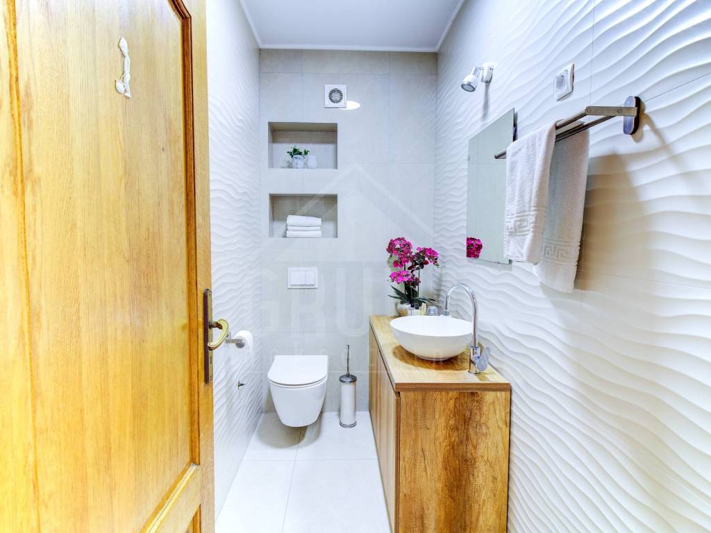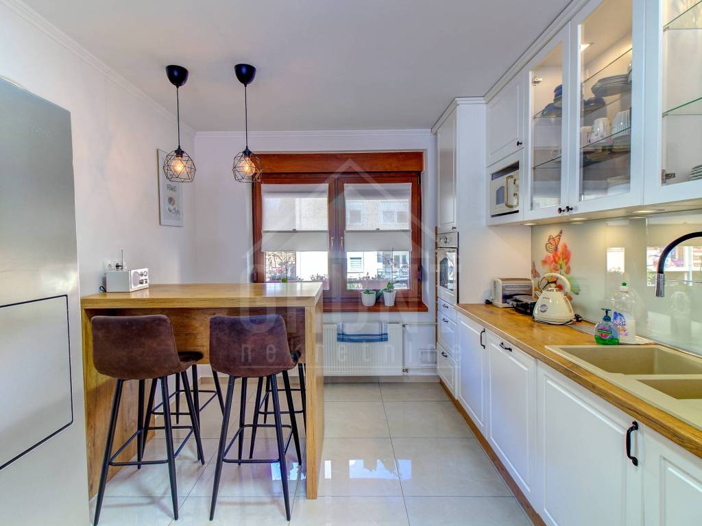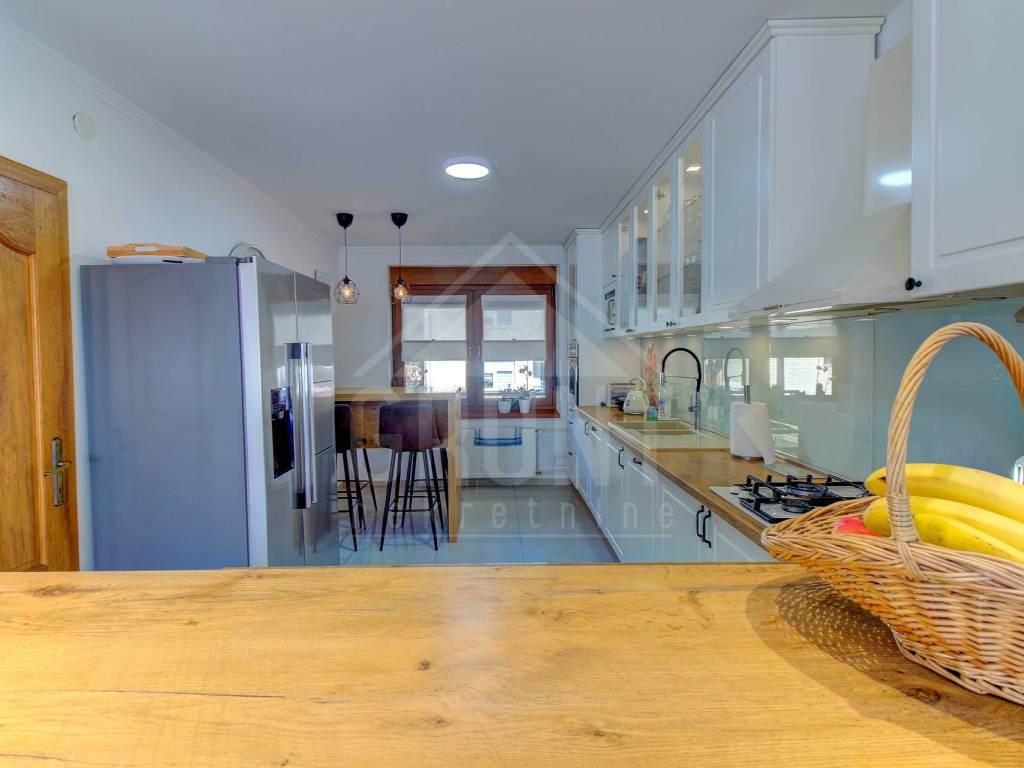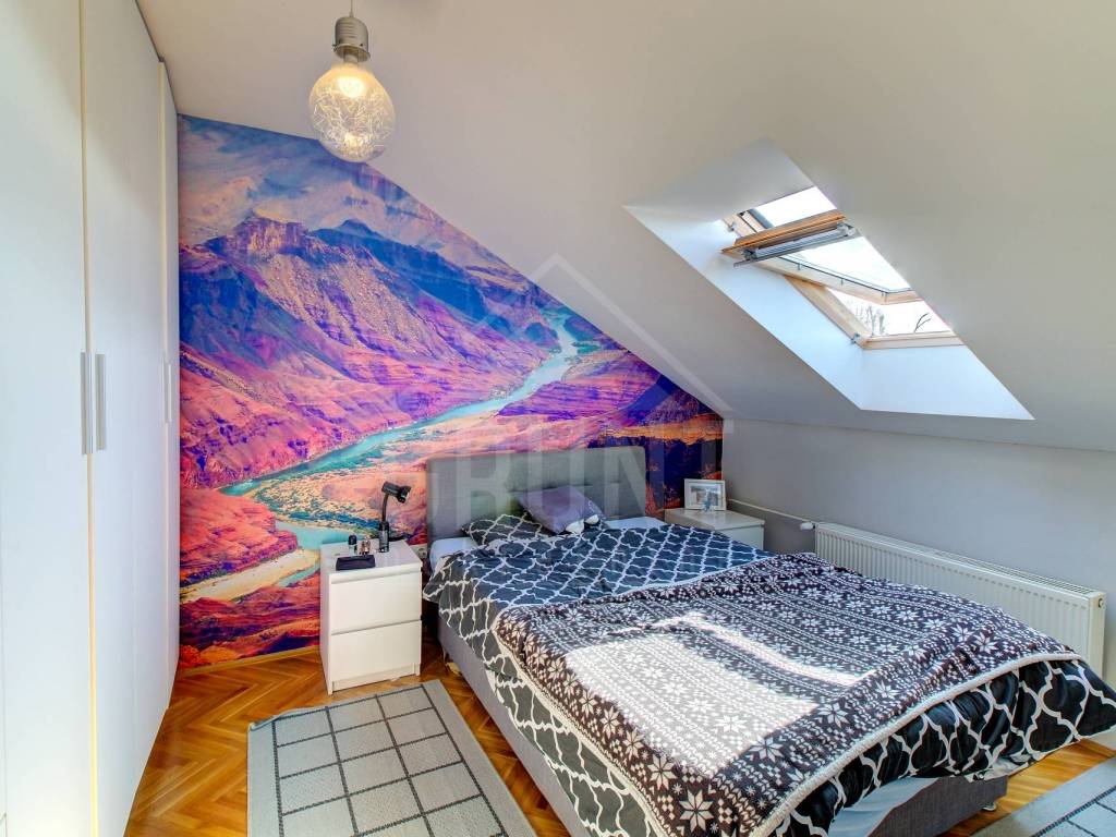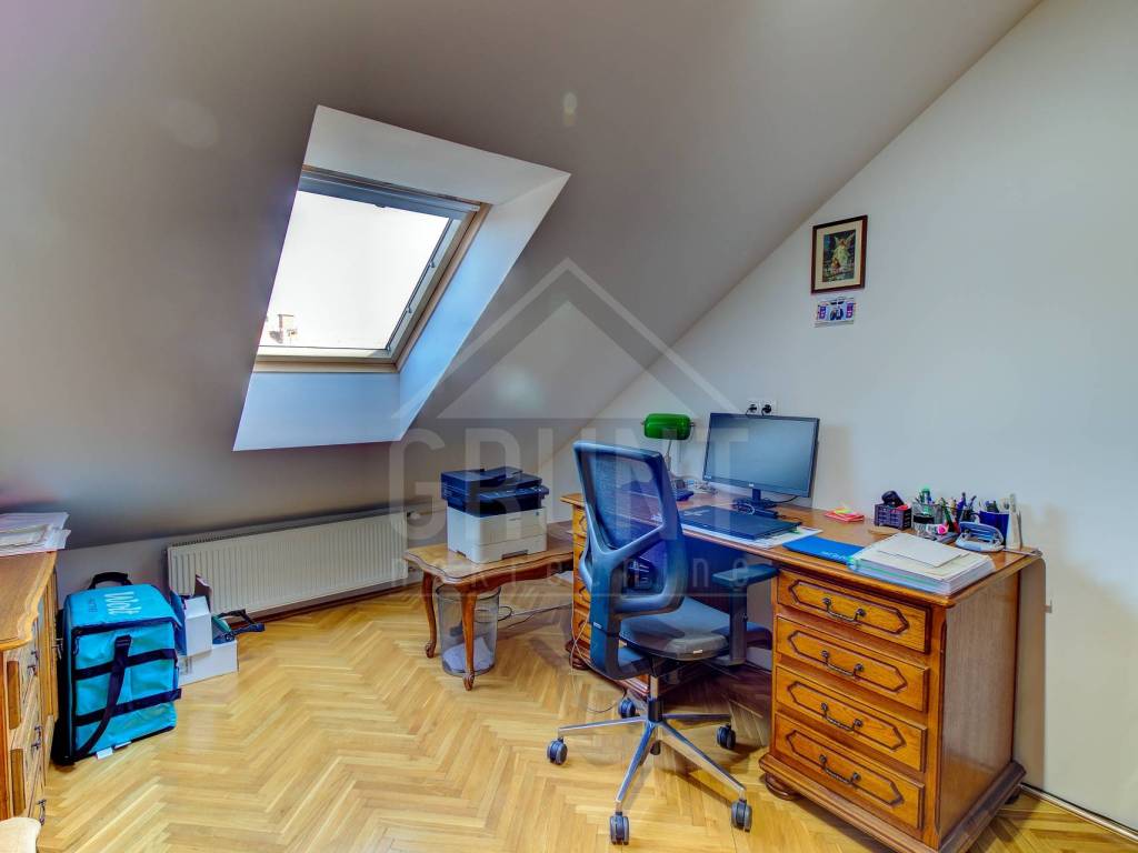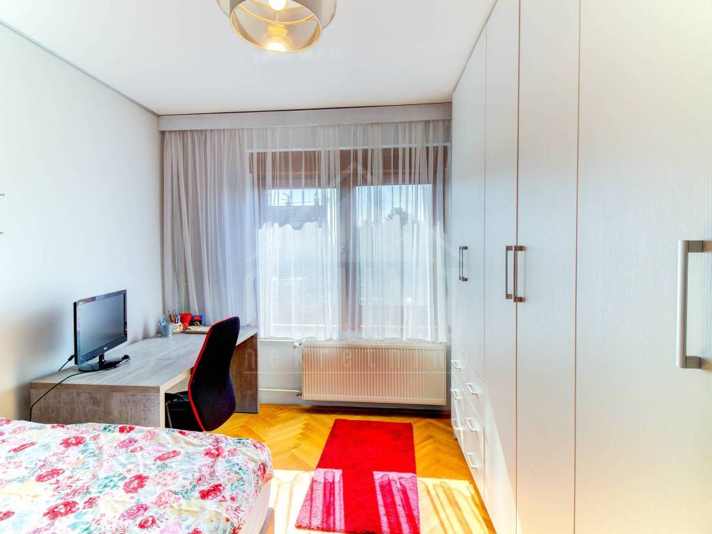 Kuća je brutto stambene površine od cca. 400 m2, a sastoji se od podruma ispod cijele kuće sa garažom, prizemlja, kata te potkrovlja (svaka etaža je cca. 100 m2 brutto). U prizemlju se nalazi predsoblje sa garderobom iz kojega se ulazi veliki dnevni boravak sa blagovaonicom i kuhinjom koji ima izlaz na terasu te gostinjski toalet. Drvena stubišta povezuju sve četiri etaže. Na katu se nalazi glavna spavaća soba sa pripojenom vlastitom kupaonicom i walk-in ormarom, dvije spavaće sobe i kupaonica. U potkrovlju se nalazi velika spavaća soba sa vlasitim dnevnim boravkom, gostinjska spavaća soba te radna soba (spavaća soba) i kupaonica. U podrumu se nalazi velika garaža sa električnim rolo vratima, te 4 prostorije sa visinom od cca 2,50 m (trenuntni raspored: vešeraj, ostava i dvije prostorije bez namjene – potencijal za teretanu, saunu, ljetnu kuhinju itd. Itd.).