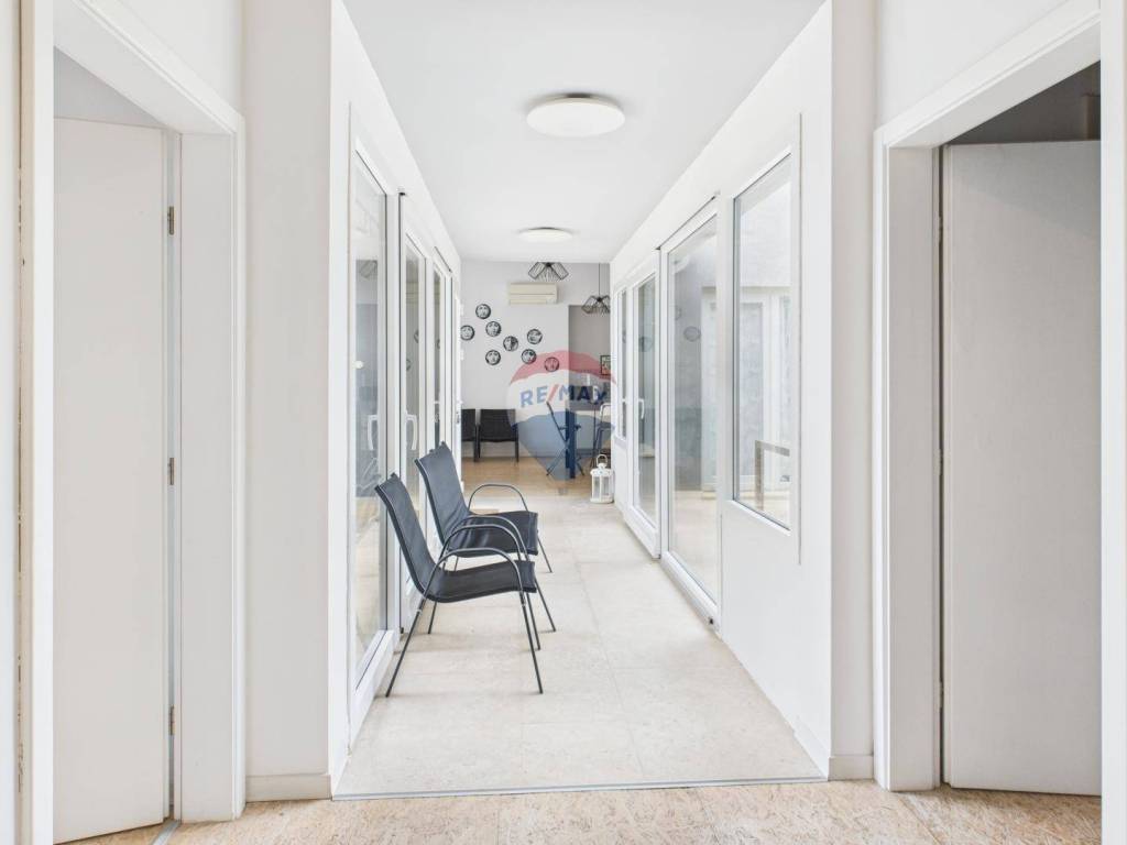 Lijevi dio kuće čini dnevni prostor s dnevnim boravkom i kuhinjom otvorenog koncepta te dodatni WC. Središnji dio povezuje ostakljeni hodnik koji s jedne strane vodi u unutarnje dvorište s prostorom za roštiljanje, a s druge omogućuje izlaz na bazen i ostatak okućnice.