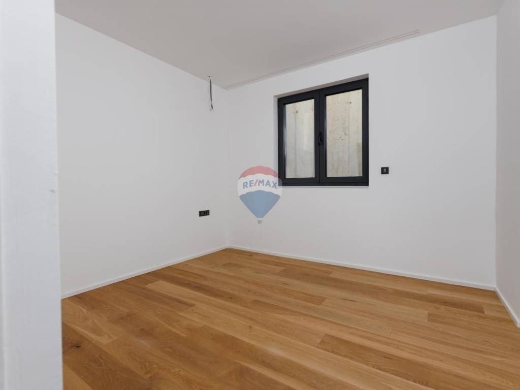 Predmetni stan se nalazi u visokom prizemlju (na etaži niže se nalaze garaže) ukupne površine 86,49 m2, a sastoji se od: 2 spavaće sobe (svaka sa svojom vlastitom kupaonicom), dodatnog wc-a, dnevnog boravka s kuhinjom i blagovaonom, hodnika i natkrivene terase s pogledom na more.
