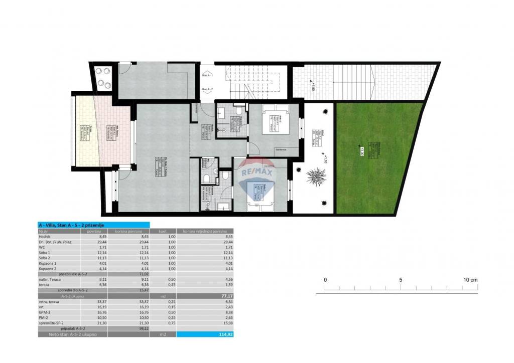 Stan također u vlasništvu ima: garažno parkirno mjesto, vanjsko parkirno mjesto, ostavu, te okućnicu (sveukupna površina navedenih pripadaka je 98,12 m2).