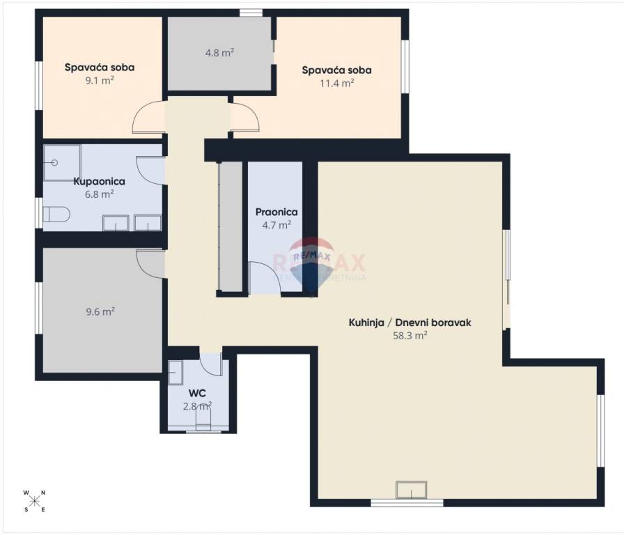 Proteže se ulaznim hodnikom koji se odvaja u spavaći dio koji ima tri prostrane spavaće sobe, kupaonicu, toalet i ostavu. Glavna spavaća soba ima ostakljen garderobni ormar.