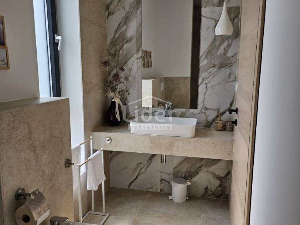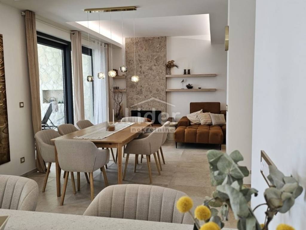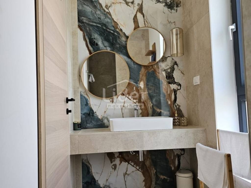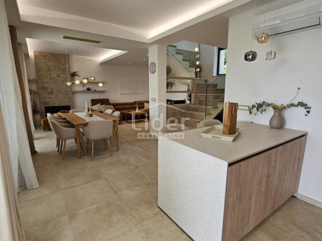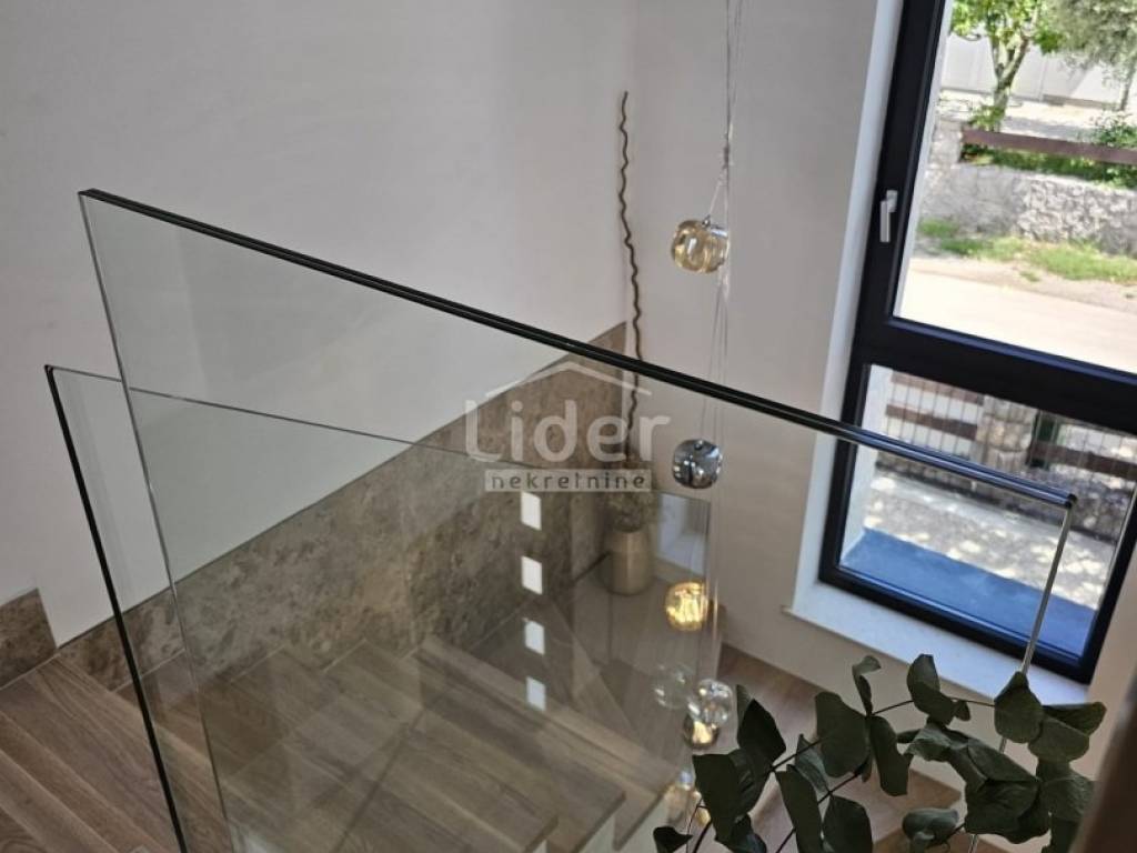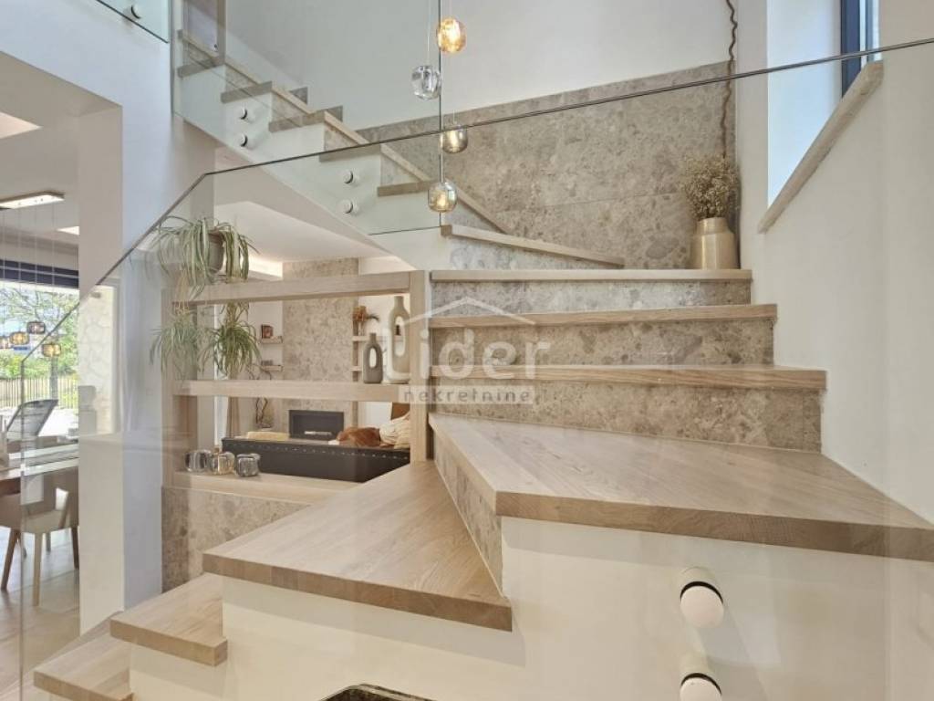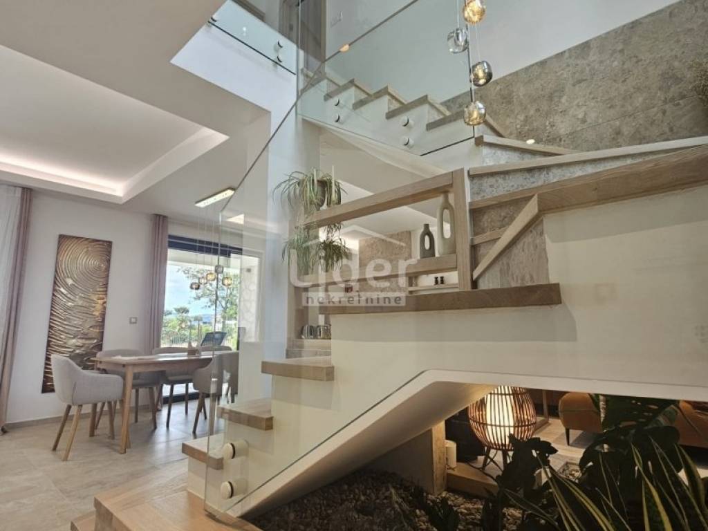 Kuća se prostire na dvije etaže. U prizemlju se nalazi prostrani dnevni boravak, kuhinja s blagovaonicom te WC. Na prvom katu nalaze se četiri spavaće sobe, svaka s vlastitom kupaonicom, što pruža visoku razinu komfora i privatnosti.