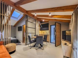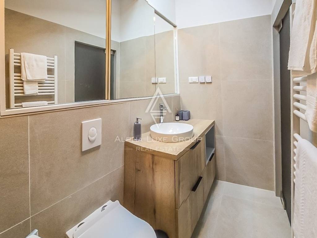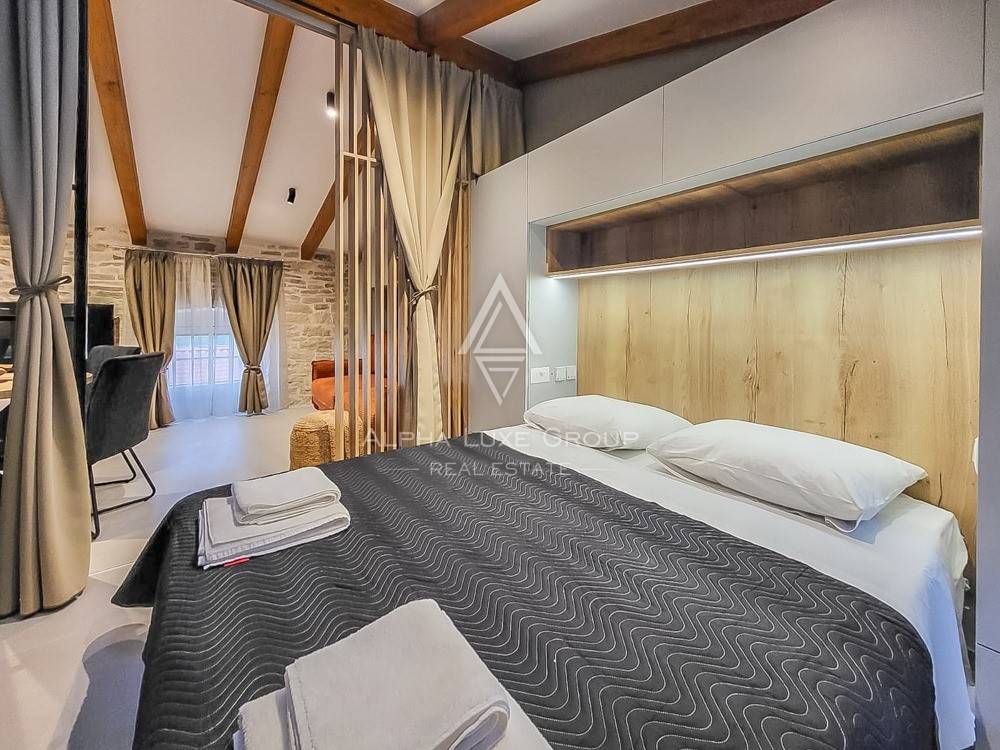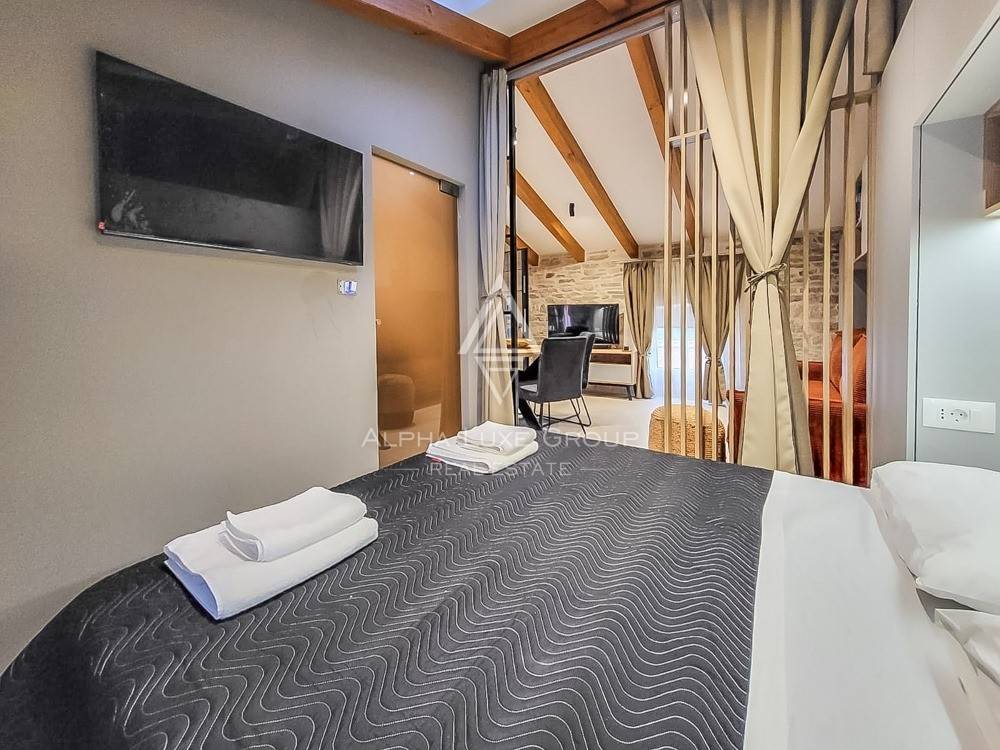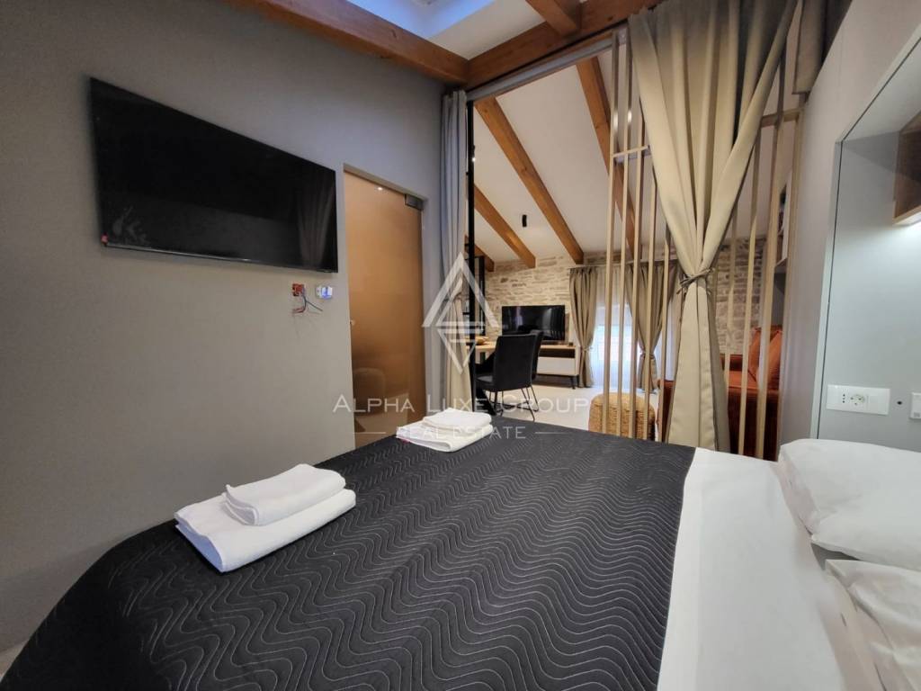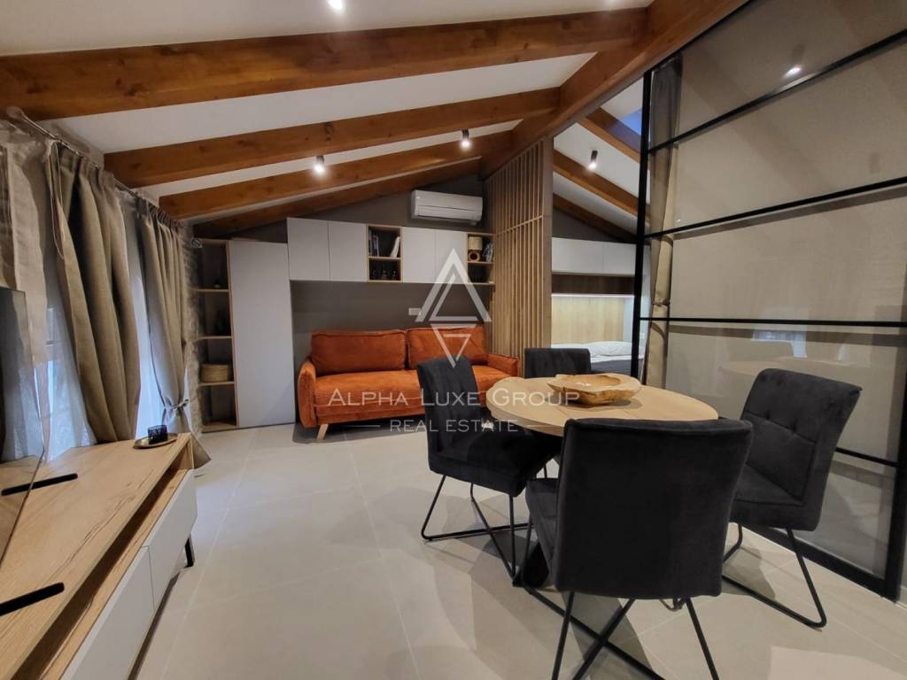 Prostor za spavanje smješten je u središnjem dijelu stana i diskretno je odvojen zavjesama, čime se stvara intiman i miran kutak za odmor. Drveni elementi u dizajnu i nježna ambijentalna rasvjeta dodatno naglašavaju ugodnu atmosferu prostora. Dnevni dio moderno je uređen i elegantno namješten te se prirodno nastavlja na kuhinju koja je kompaktna, ali potpuno funkcionalna i opremljena za svakodnevnu pripremu obroka.