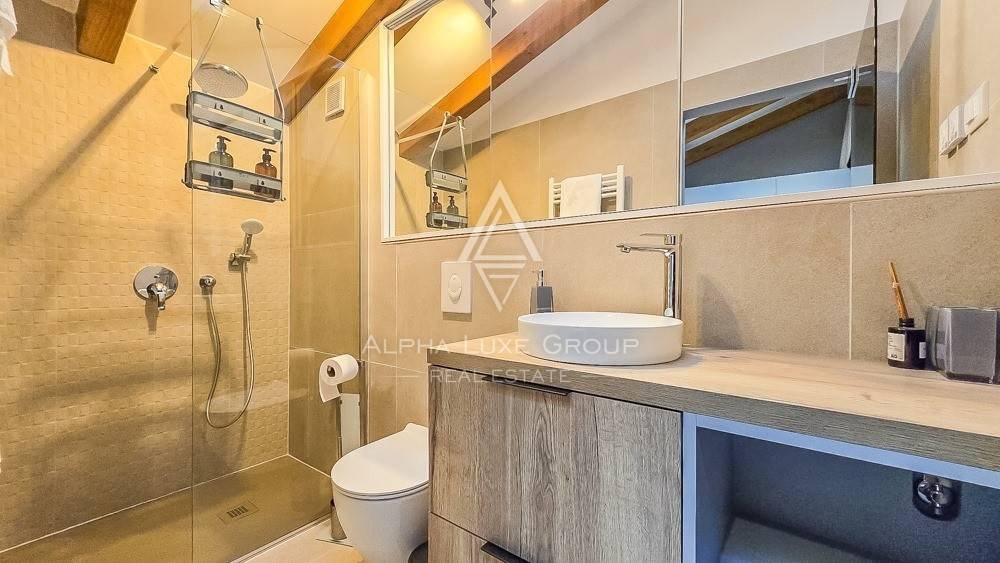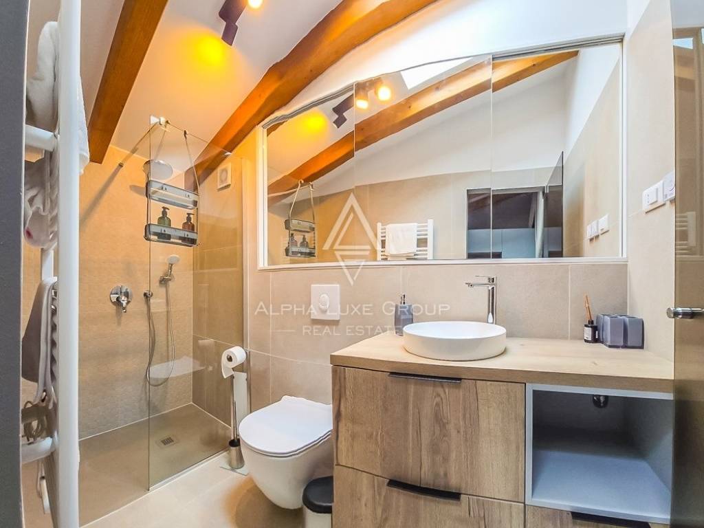 Kupaonica je uređena u suvremenom stilu s čistim linijama i pažljivo odabranim materijalima koji prostoru daju elegantan i luksuzan dojam. Veliki prozori i staklene površine omogućuju obilje prirodne svjetlosti, dok krovni prozori dodatno unose toplinu i svjetlost tijekom cijelog dana.
