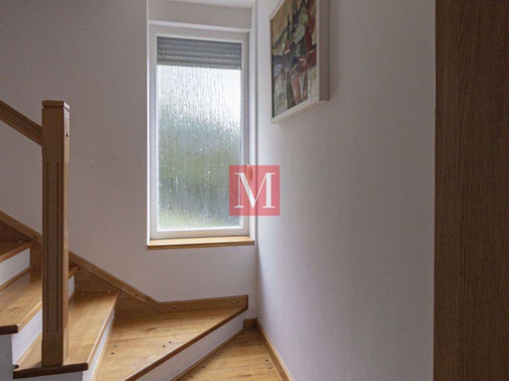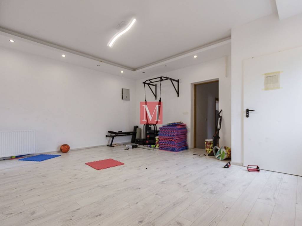 Kuća se sastoji od ulaznog hola, unutarnjeg i vanjskog stubišta, 2 kuhinje, 5 spavaćih soba, jednog velikog open space dnevnpog boravka s balgovaonicom, 2 kupaonice, 2 toaleta od kojih jedan služi kao praona, teretane/fitness sobe, 2 terase, ostave i predivne okućnice koja je uređena i opremljena roštiljem.