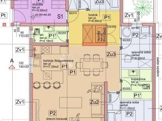 Sastoji se od kuhinje i blagovaonice, dnevnog boravka, 3 spavaće sobe, kupaonice, WC-a, ostave i terase.