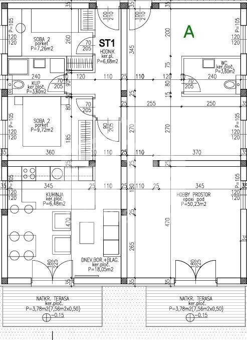 Također je u zgradi dostupan prostor oznake A na tlocrtu, od 53,83 m2 prostora s kupaonicom i wcom, te natkrivene terase od 7,56 m2. Po cijeni od 160.000 EUR