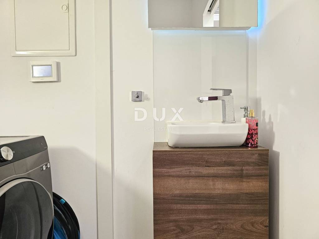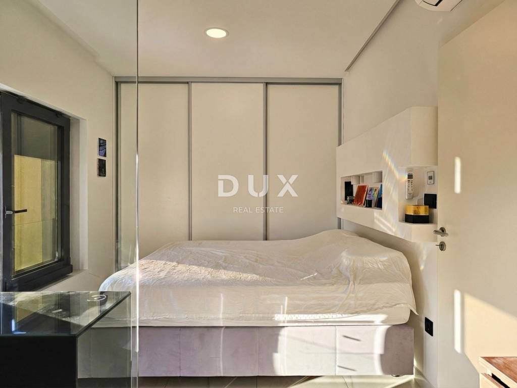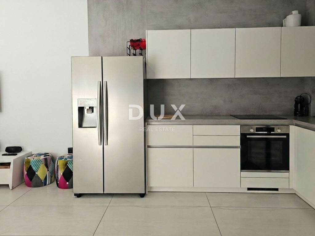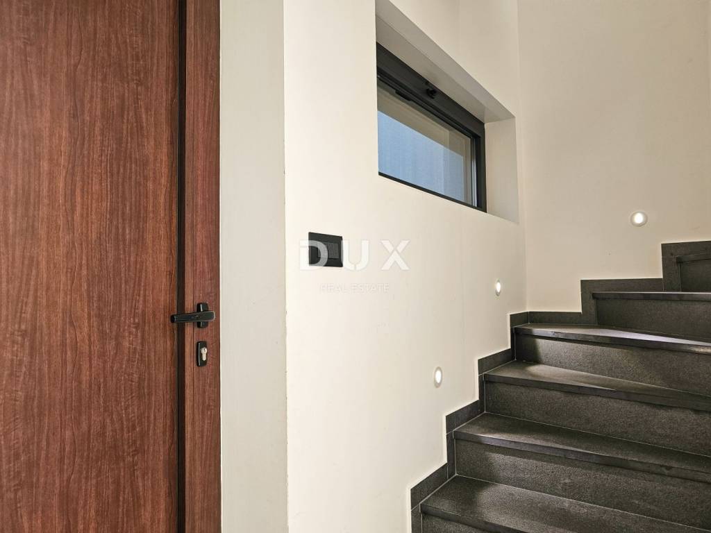 U prizemlju je prozračan dnevni prostor, sadržan od ulaznog dijela s ugradbenim ormarom, gostinjskim toaletom i tehničkom prostorijom, opremljene kuhinje, blagovaonice i dnevnog boravka. Zahvaljujući staklenoj stijeni širine ~ 5m, stan je prirodno osvijetljen i stvara se savršen i topli ugođaj. Iz dnevnog dijela izlazi se na vlastiti, privatni vrt s natkrivenom terasom od 11 m2, zelenom površinom (umjetna trava postavljena 2025. godine), vanjskim tušem s toplom vodom te bazenom od 17 m2.