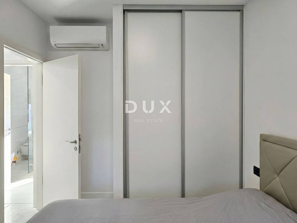 Unutarnje stubište vodi na prvi kat s dvije spavaće en-suite sobe. Ugradbeni ormari po cijeloj visini za praktičnost, boxspring kreveti, klimatizirane, s pogledom na okoliš i djelomičnim pogledom na more. Svaka soba opremljena je Grohe tušem i Villeroy & Boch sanitarijama.