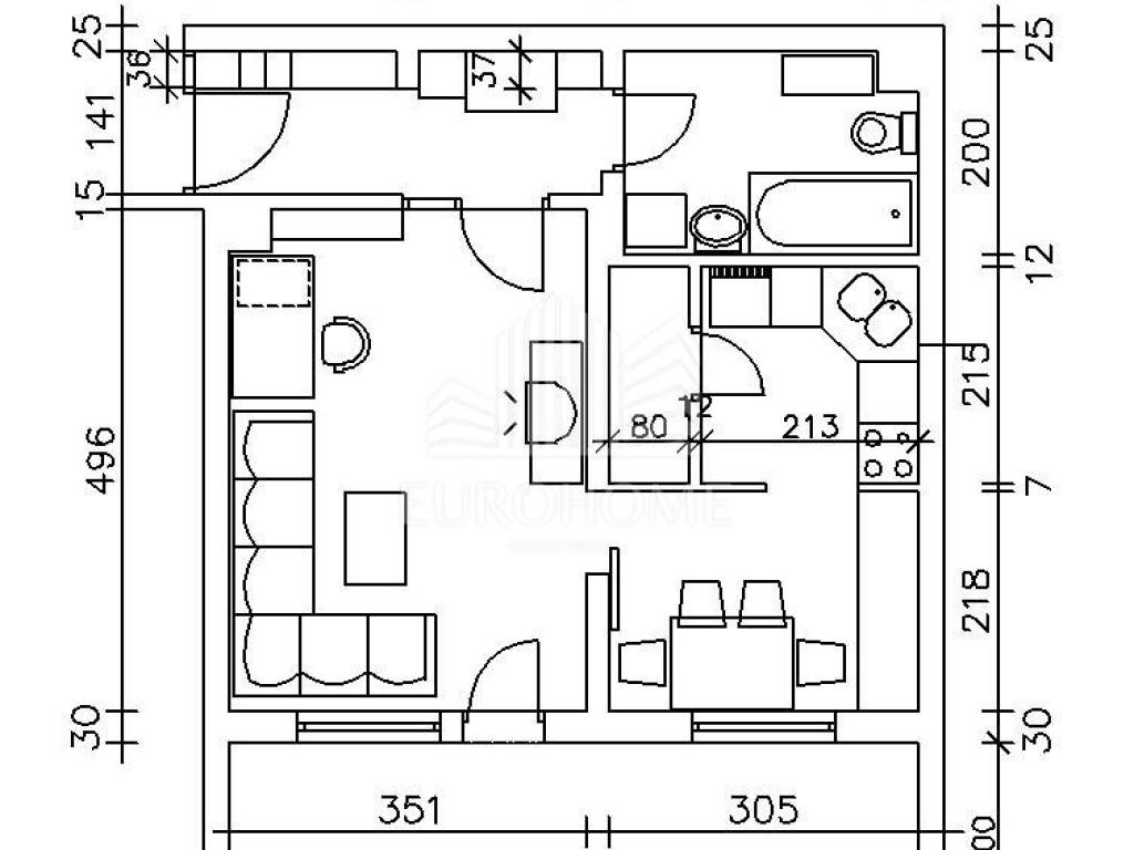 Postoji mogućnost preuređenja blagovaonice u malu spavaću sobu spajanjem s ostavom i kuhinjom.