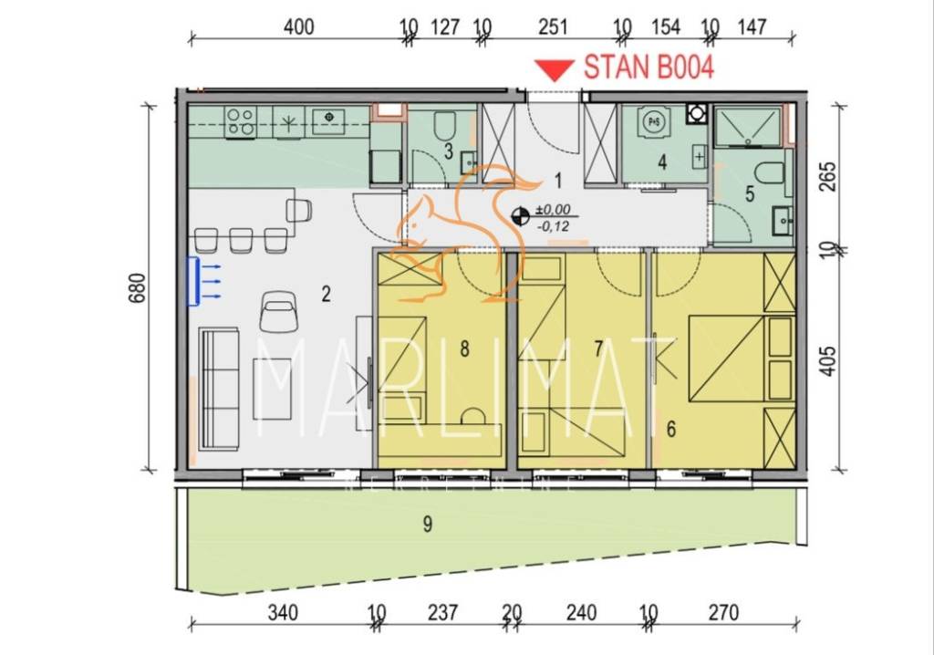 Hodnika 10m2tri spavaće sobe 10.80m2, 9.60m2, 9.60m2zaseban wc 1.95m2ostava(mjesto za bojler, perilicu i sušilicu rublja) 2.20m2kupaonica 3.80m2dnevni boravak s kuhinjom i blagovaonicom 25m2natkrivena terasa i dio vrta 11m2Stanu pripadaju dva garažna mjesta ispod zgrade 13m2 + 13m2 i spremište površine 2.60m2 u prizemlju zgrade odmah nasuprot stana, tako da je praktično radi ostavljanja stvari.