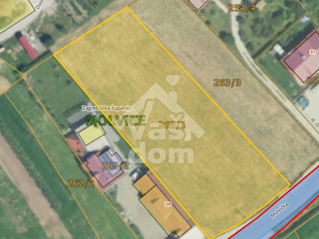 Na dobroj lokaciji u Molvicama na udaljenosti 1 km od novog vrtića i crkve prodaje se pravokutno građevinsko zemljište od 2667 m2 na blagoj strmini. Zemljište je širine cca 33 m i dubine cca 85 m te se na njemu mogu graditi dva samostojeća objekta ili četiri ugrađene stambene jedinice ( kuće u nizu). Zemljište je ograđeno s tri strane s velikom ulaznom kapijom . Do zemljišta prolazi cesta uz koju ide vodovod i struja, udaljenost Samobora je na 10 min vožnje, Kerestinac je na udaljenosti od cca 5 km, a autobusna stanica je u blizini gdje vozi besplatni prijevoz. Prirodno okruženje s šumom, livadama i potokom uz cestu pruža lokaciji iznimnu čar. Zemljište se prodaje u cijelosti