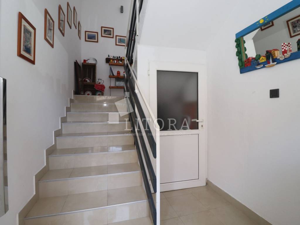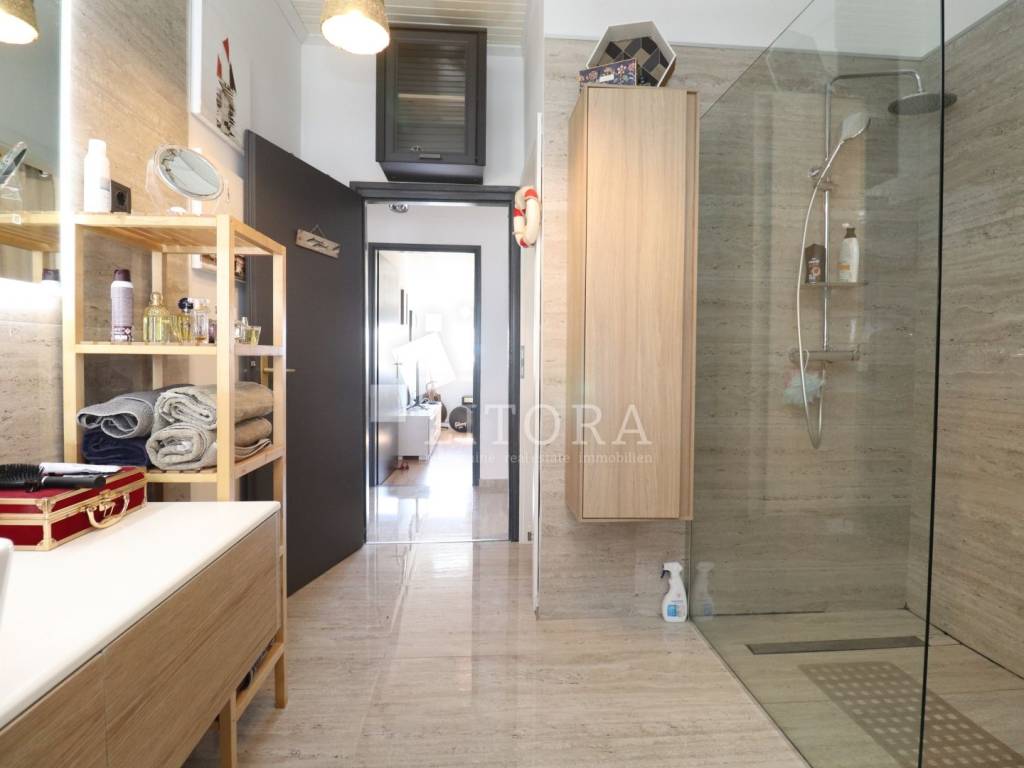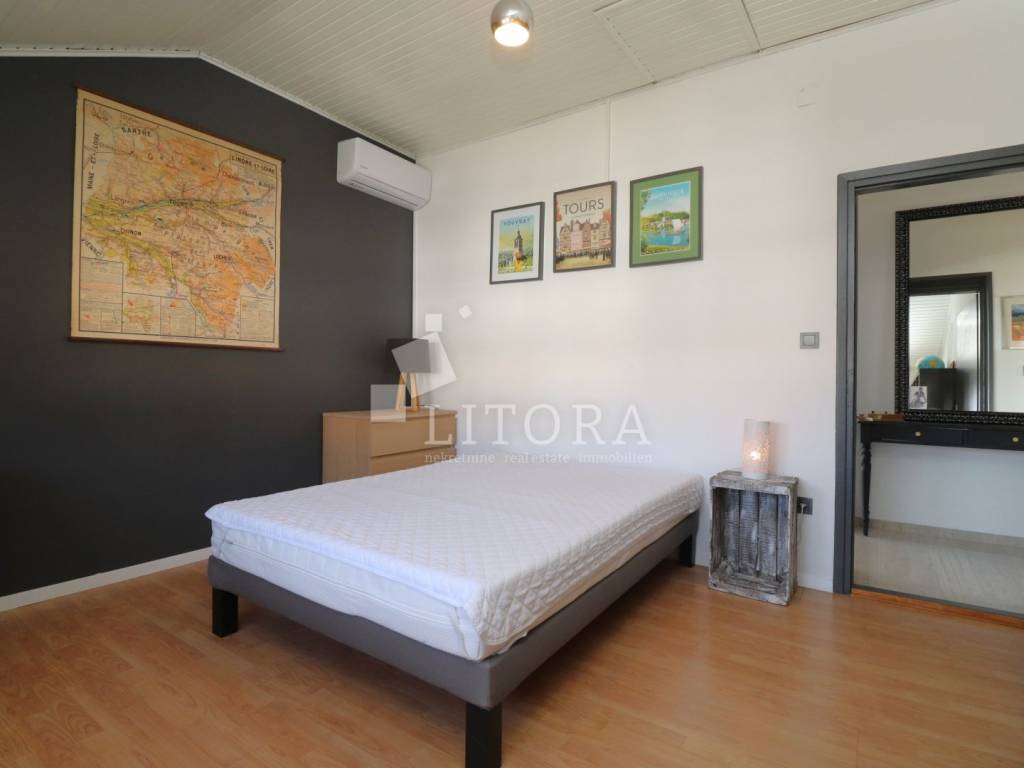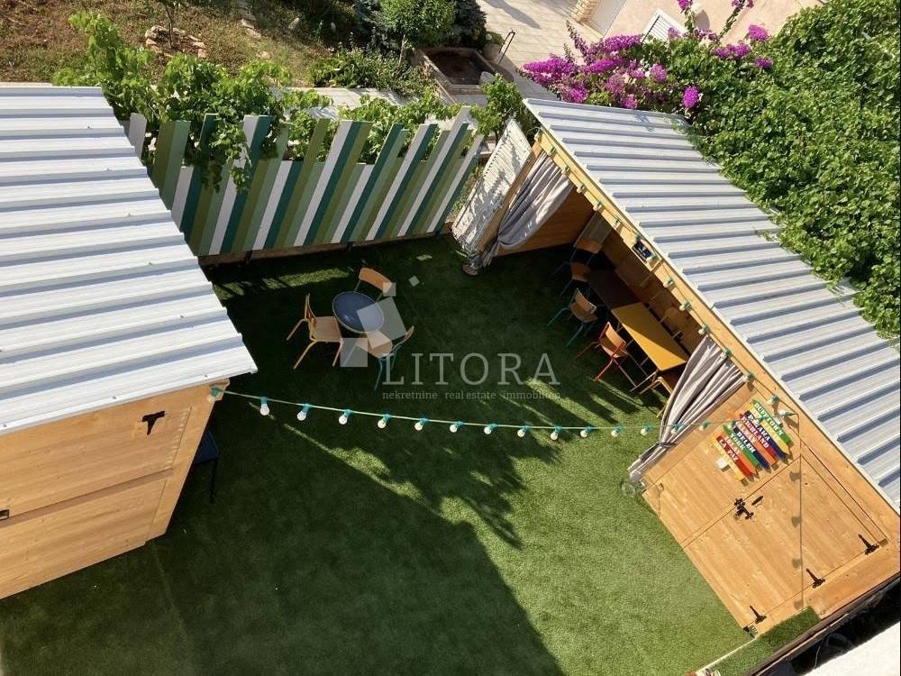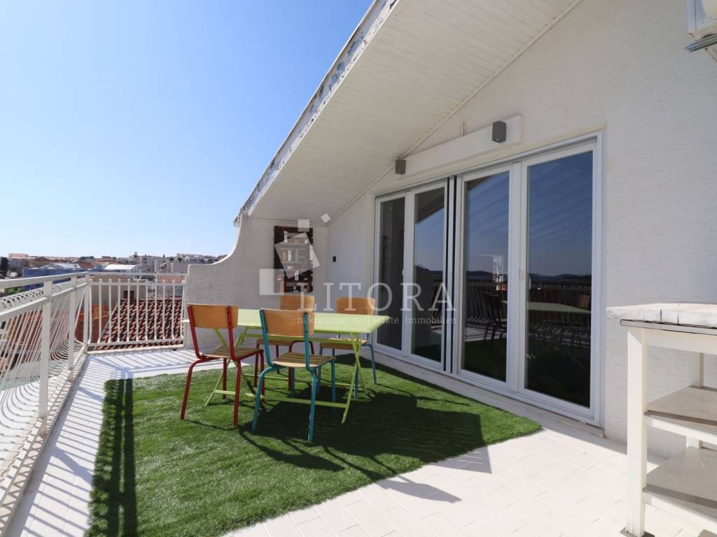 Vodice, centar – trosobni apartman s pogledom na more, velika terasa od 29,39 m² te dvorište s parkirnim prostorom za dva vozila Apartman se nalazi u centru grada Vodica, smješten na zadnjoj etaži – u visokom potkrovlju troetažne kuće u kojoj se nalaze ukupno tri stambene jedinice. Apartman ima ukupnu korisnu površinu od 140,89 m². Dvorište površine 108 m² dijelom je popločano te ima parkirni prostor za dva vozila, kao i zatvoreni dvorišni dio u kojem se nalaze drvena kućica koja služi kao ljetna kuhinja, alatnica i radionica. U dvorištu se također nalazi mali toalet. Apartman ima vlastiti stubišni prostor, odvojen od ostatka kuće, koji vodi od prizemlja do potkrovlja. Sam apartman ima površinu od 99,67 m² i sastoji se od hodnika, prostrane kupaonice s praonicom, tri spavaće sobe te prostranog dnevnog boravka s otvorenom kuhinjom. Iz dnevnog boravka izlazi se na veliku terasu od 29,39 m², orijentiranu na južnu stranu, s pogledom na more i grad Vodice. Apartman je opremljen klima-uređajem te se prodaje potpuno namješten, pri čemu je sav namještaj uključen u cijenu nekretnine. Udaljenost do plaže Vruje iznosi 850 m, dok je centar grada udaljen svega 300 m.