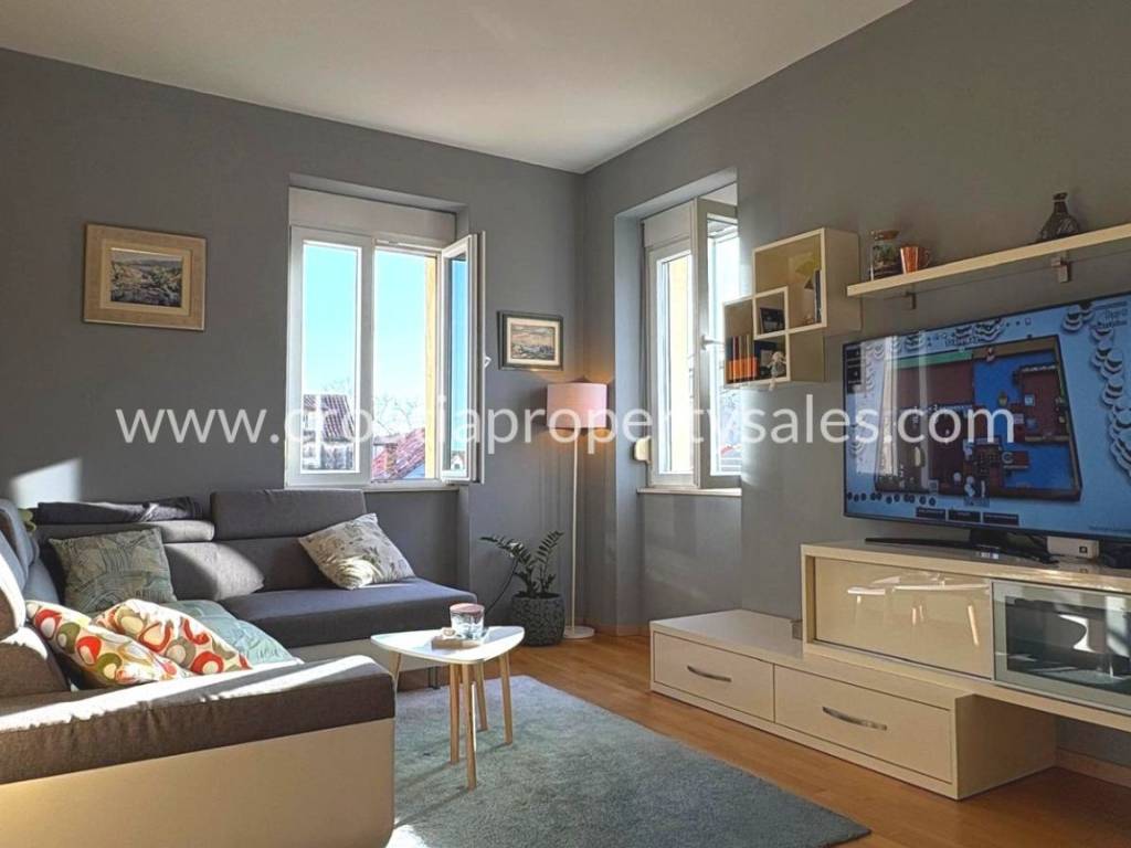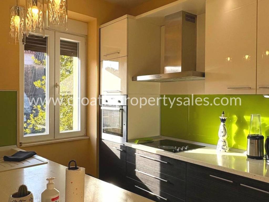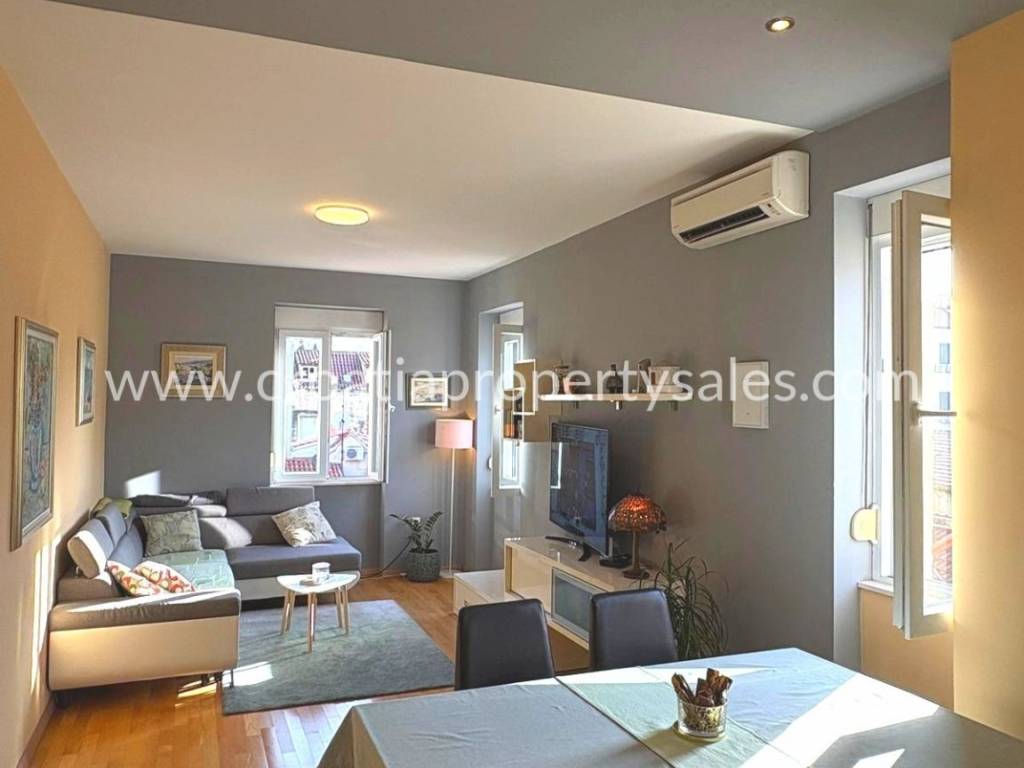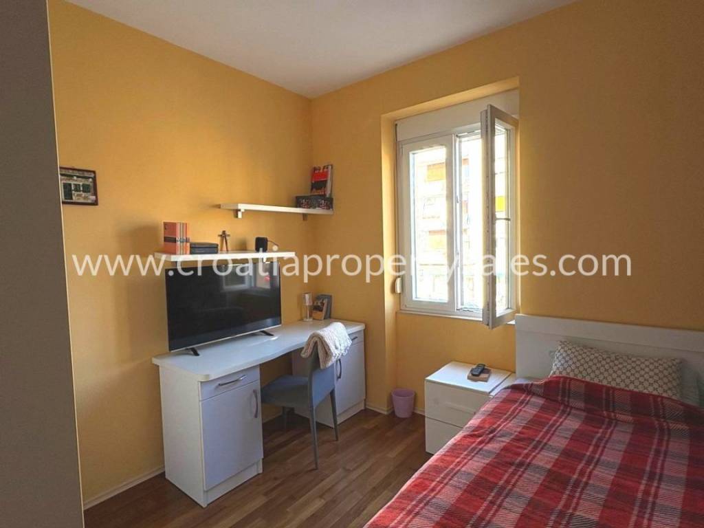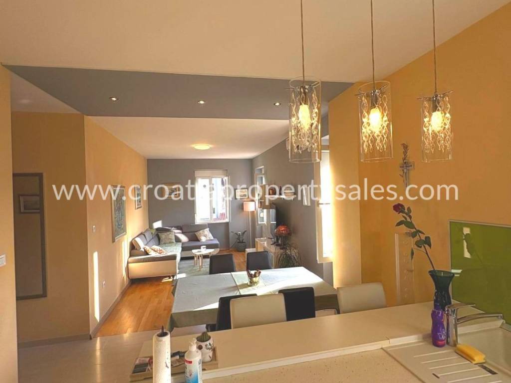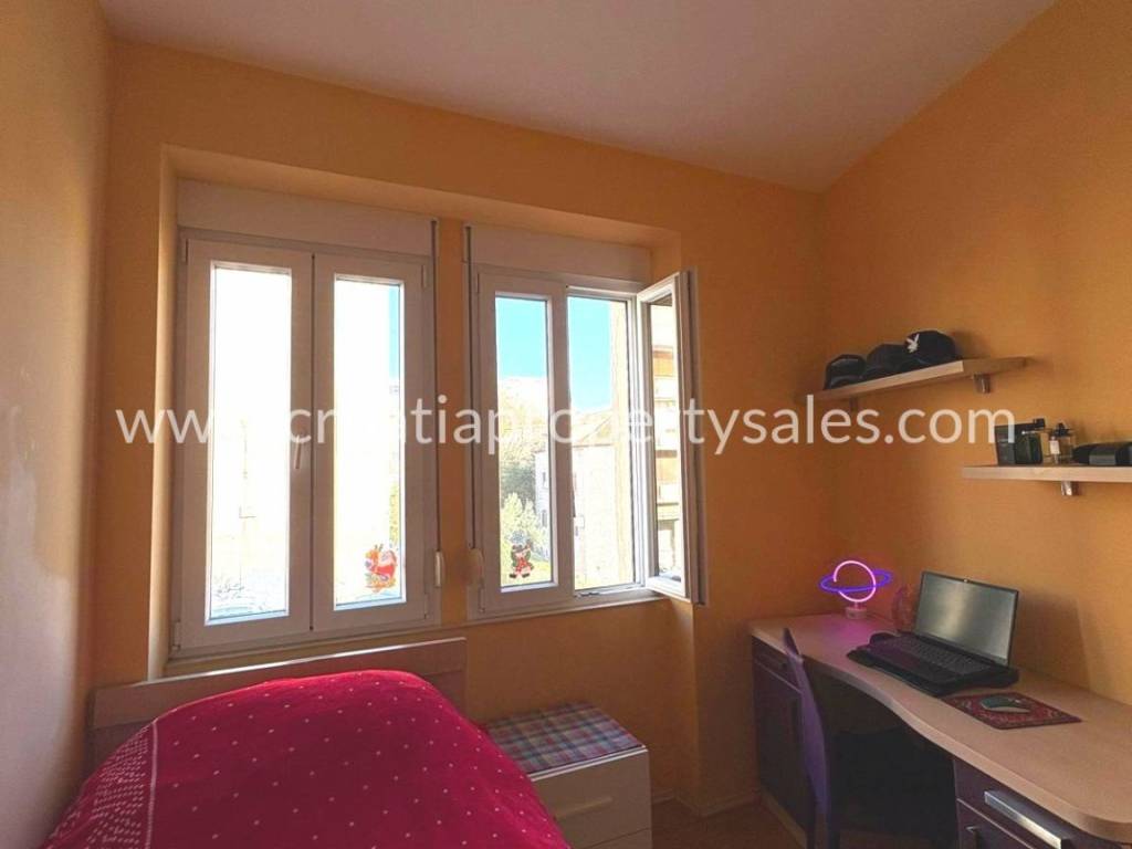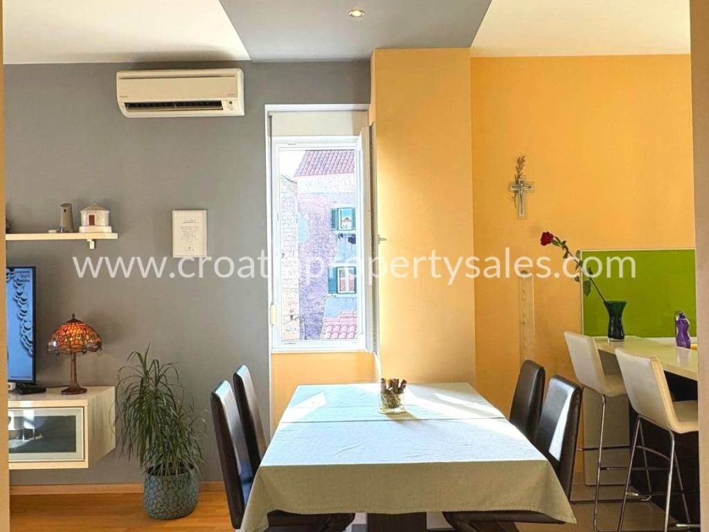 Stan u centru na drugom katu. Sastoji se od tri spavaće sobe, kupaonice, kuhinje sa blagovaonicom. Ima ukupno 80 m2 stambene površine. Kompletno je uređen prije 6 godina, kompletni namještaj je rađen po mjeri. Nisu potrebna dodatna ulaganja. Stan se nalazi na lijepoj lokaciji u blizini Dioklecijanove palače, ali nije u prometnoj ulici, nego u mirnom kvartu. Kuća je obnovljena i ima samo 3 kata. Ispred zgrade nalazi se lijepo zajedničko dvorište sa kaminom. Moguće je doći autom na samo par metara od kuće.