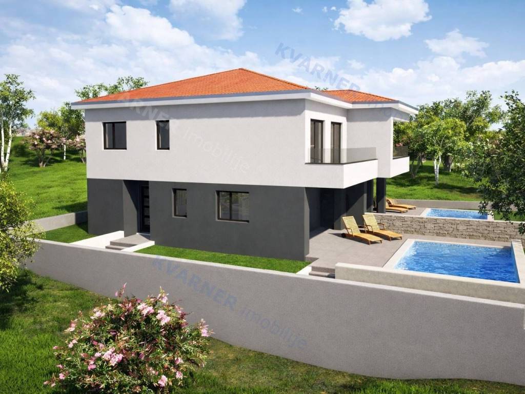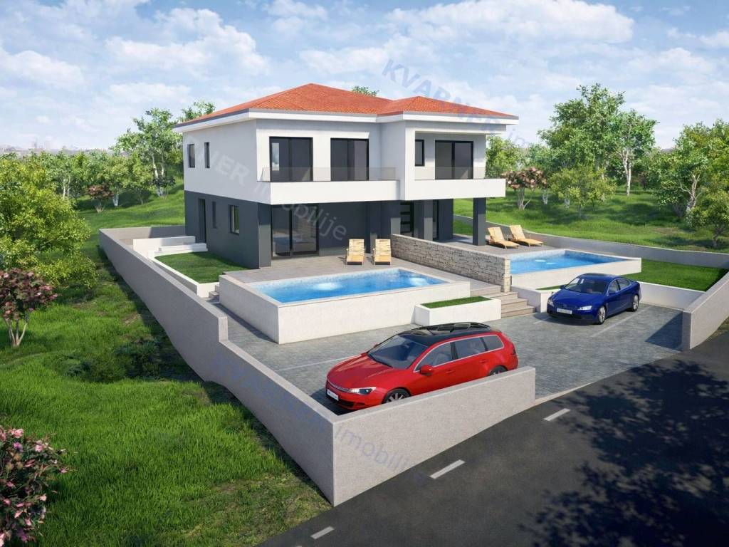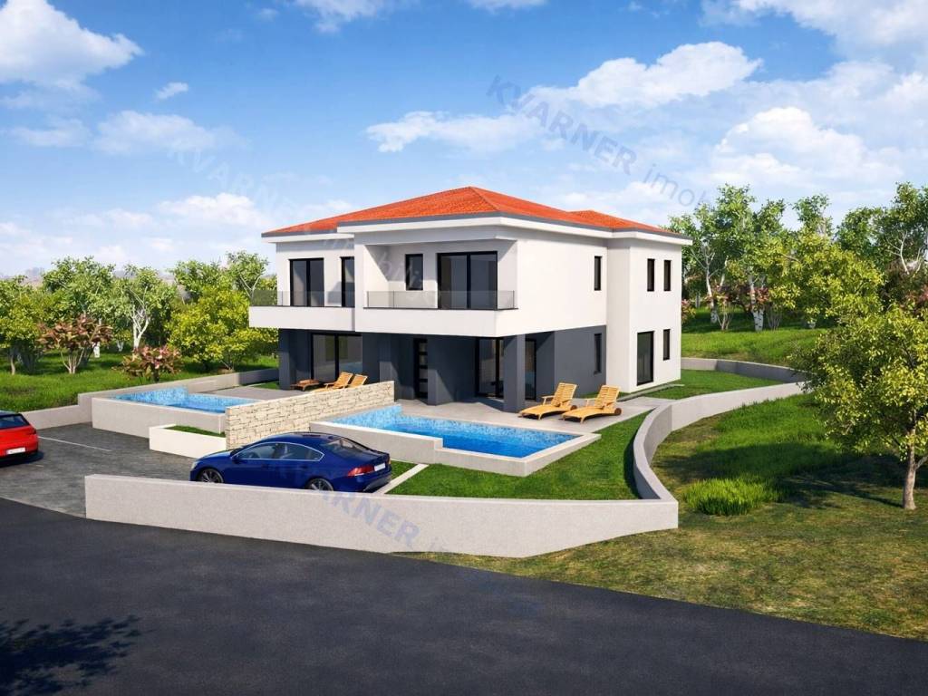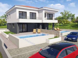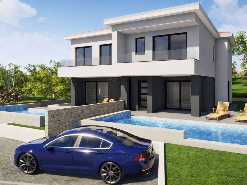 Na prodaju je nova dvojna kuća s bazenom na mirnoj lokaciji, udaljena svega 800 metara od centra mjesta i mora.