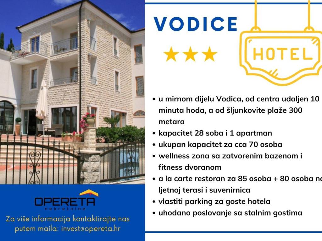 INVESTICIJSKA PRILIKA HOTEL VODICE Hotel u samoj blizini hotelskih kompleksa Imperial i Olympia Sky. Smješten je u mirnom dijelu Vodica, od centra udaljen 10 minuta hoda, a od šljunkovite plaže 300 metara. OSNOVNE ZNAČAJKE: Tri zvjezdice *** U cijelosti klimatiziran Kapacitet 28 soba i 1 apartman Ukupan kapacitet za cca 70 osoba Sobe su dvokrevetne, s mogućnošću trećeg, dodatnog kreveta Potpuno opremljen sa SAT TV, internet vezom, telefonom i mini barom Wellness zona sa zatvorenim bazenom i fitness dvoranom A la carte restoran za 85 osoba + 80 osoba na ljetnoj terasi i suvenirnica Vlastiti parking za goste hotela Uhodano poslovanje sa stalnim gostima