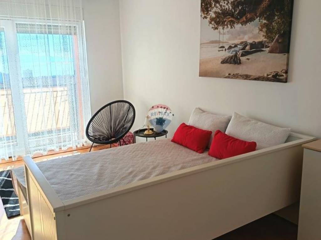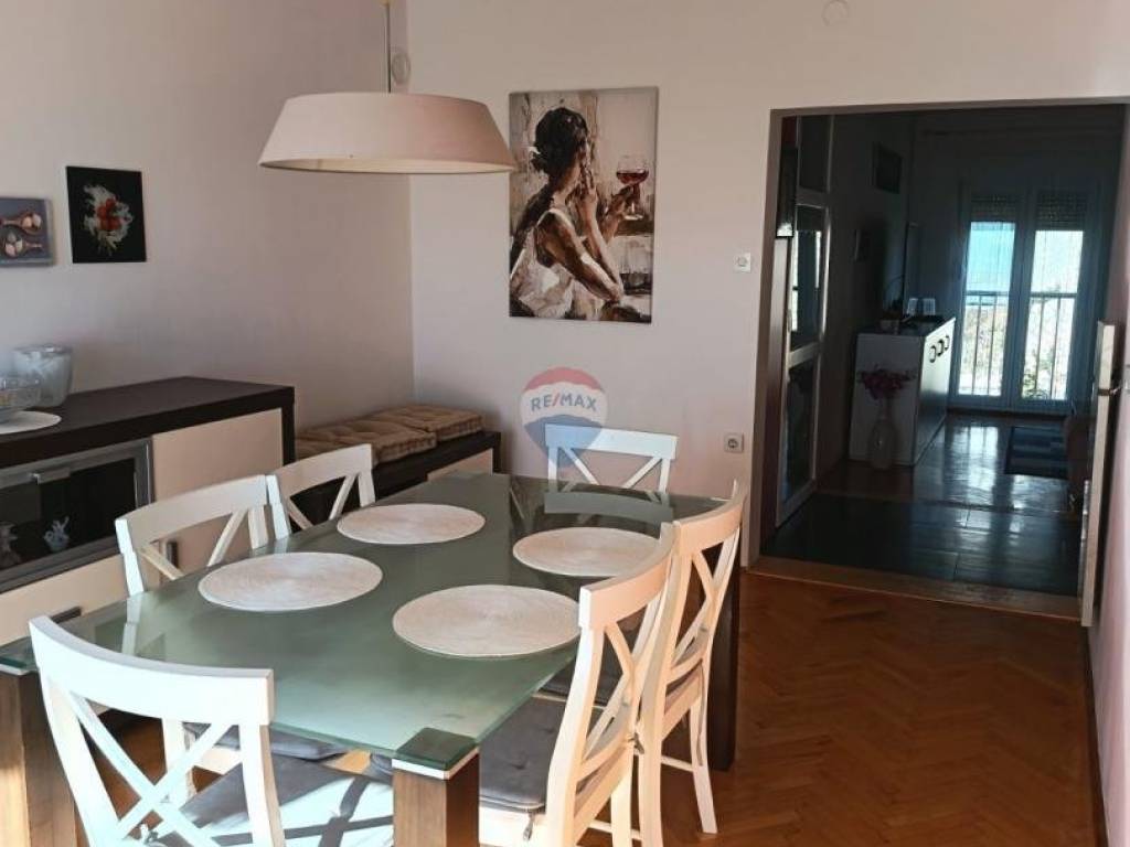 Stan je svijetao, pun dnevnog svjetla s pogledom na more i grad.