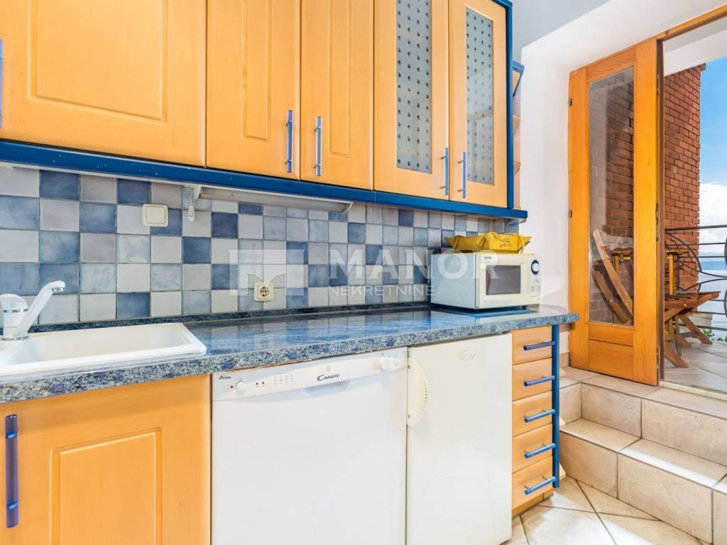 Manor predstavlja stan u villi s uređenom okućnicom i veličanstvenim pogledom na more. Stan je smješten u mirnome predjelu Opatije, udaljen tek pet minuta hoda od samoga mora i petnaest minuta od njezina središta. Spustite li se na Lungomare, poznatu obalnu šetnicu tik uz more dugačku oko 12 kilometara koja spaja pet manjih mjesta –  Volosko, Opatiju, Ičići, Iku i Lovran, imat ćete priliku otkriti brojne prirodne ljepote uz samu obalu. Iznad kuće se nalazi i manje dječje igralište s raznim zabavnim spravama za djecu, a imate li kućnog ljubimca,  prava stvar za njega upravo je lijepo uređena i ograđena plaža za pse koja je šetnicom uz more od nas udaljena tek 7 minuta hoda. Za one koji vole boraviti u prirodi mogu uživati u blagodatima šume te njome šetati i do preko 5 km. Ako ipak niste za šetnju ili ste u žurbi, ispod kuće se nalazi autobusna stanica, a ondje je i market.  Predmetni stan nalazi se na prvome katu obiteljske kuće sa vlastitim ulazom i kapacitetom za smještaj 6 osoba. Stan ima dvije prostrane dvokrevetne spavaće sobe i jednu manju jednokrevetnu sobu,  dnevni boravak sa kaučem na razvlačenje za dvije osobe, tri kupaonice (tuš/WC), prostranu kuhinju, ostavu te izlaz na balkone i terasu. Dnevni boravak ima izlaz na prvi balkon s prekrasnim pogledom na more, a kuhinja ima izlaz na drugi balkon. Kuhinja ima još jedan izlaz na terasu natkrivenu suncobranom. Također stan je opremljen klima uređajem u spavaćoj sobi i dnevnom boravku, besplatnim wi-fijem, SAT TV, perilicom rublja i suđa  ID KOD AGENCIJE: 119-123  MANOR NEKRETNINE d.o.o. Mob: +385 99 365 7230 Tel: +385 51 504 909 E-mail: info@manor.hr www.manor.hr