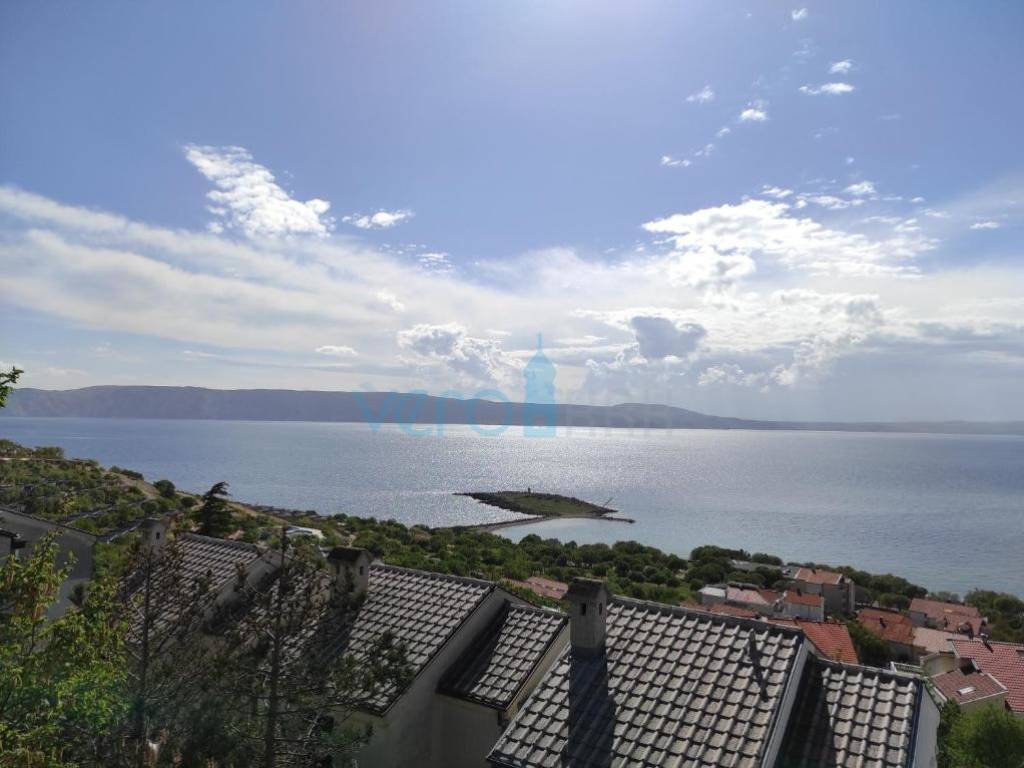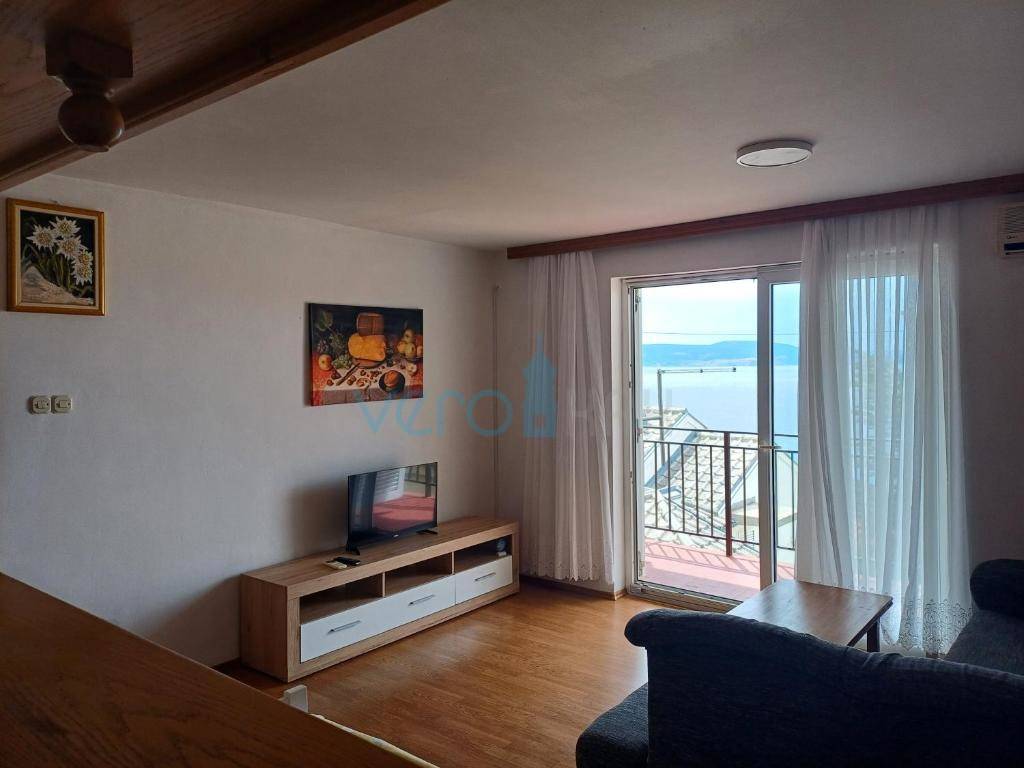 Novi Vinodolski, Klenovica, dvije etaže dvojne kuće, sa prekrasnim pogledom na more. Ova zanimljiva nekretnina se nalazi na atraktivnoj lokaciji mjesta Klenovica, sa vrlo jednostavnim pristupom. Dvije etaže dvojne kuće kroz cca. 140m2 stambenog prostora i terasa, raspoređene su kao jednosoban stan sa terasom u niovu prilazne ceste i parkinga te studio u potkrovlju. Na prilazu je prostrano natkriveno mjesto za parkiranje (28,54m2). Nekoliko stepenica vodi do ulaza u stan koji se sastoji od: kuhinje sa dnevnim boravkom (24,13m2), blagovaonice (8,93m2), sobe (10,41m2), kupaonice (3,61m2), lođe (6,23m2), te nenatkrivene terase (4,47m2). Vanjske stepenice vode u potkrovlje gdje je kupaonica (3,61m2), soba (29,92m2) i terasa (11,79m2). Nekretnini pripada i spremište od 7m2 te dio dvorišta. Dnevni boravak i kupaonica su renovirani 2023.g. Prednost ove nekretnine su jednostavnost pristupa, prozračna lokacija i koncept koji otvara mogućnost korištenja kao dvije zasebne jedinice.