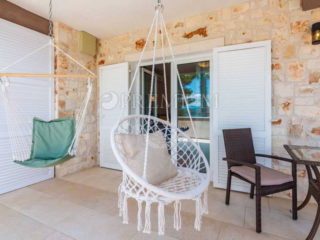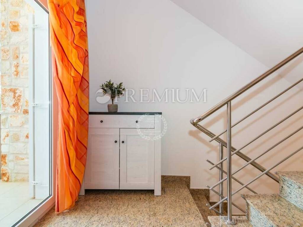 Unutarnje stepenište vodi na prvi kat gdje se nalaze hodnik, dvije kupaonice i dvije spavaće sobe. Obje sobe imaju izlaz na veliku terasu površine 42 m² s koje se pruža prekrasan pogled na more.