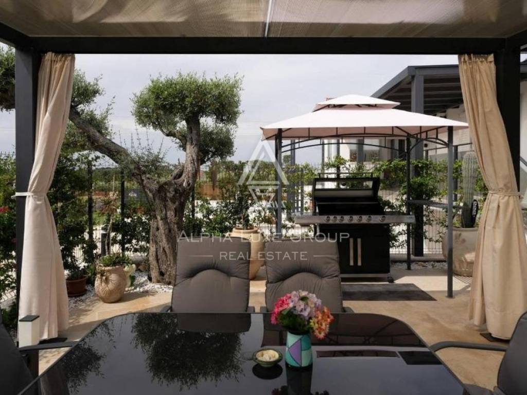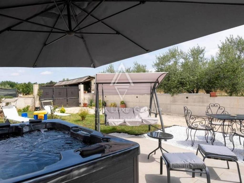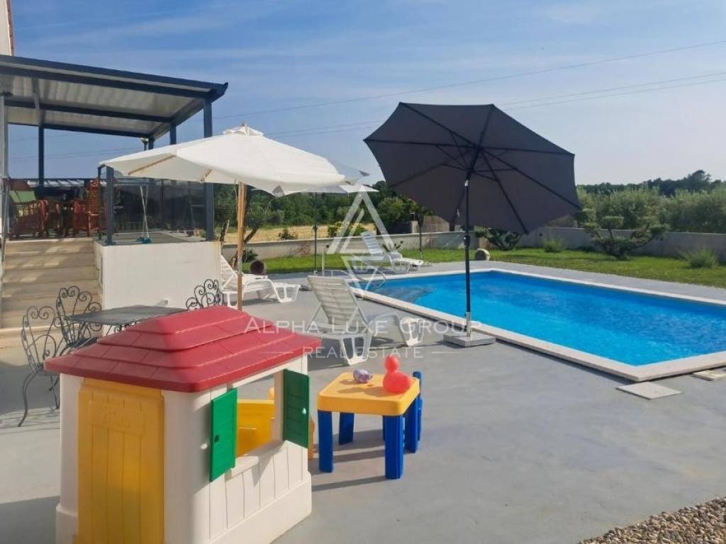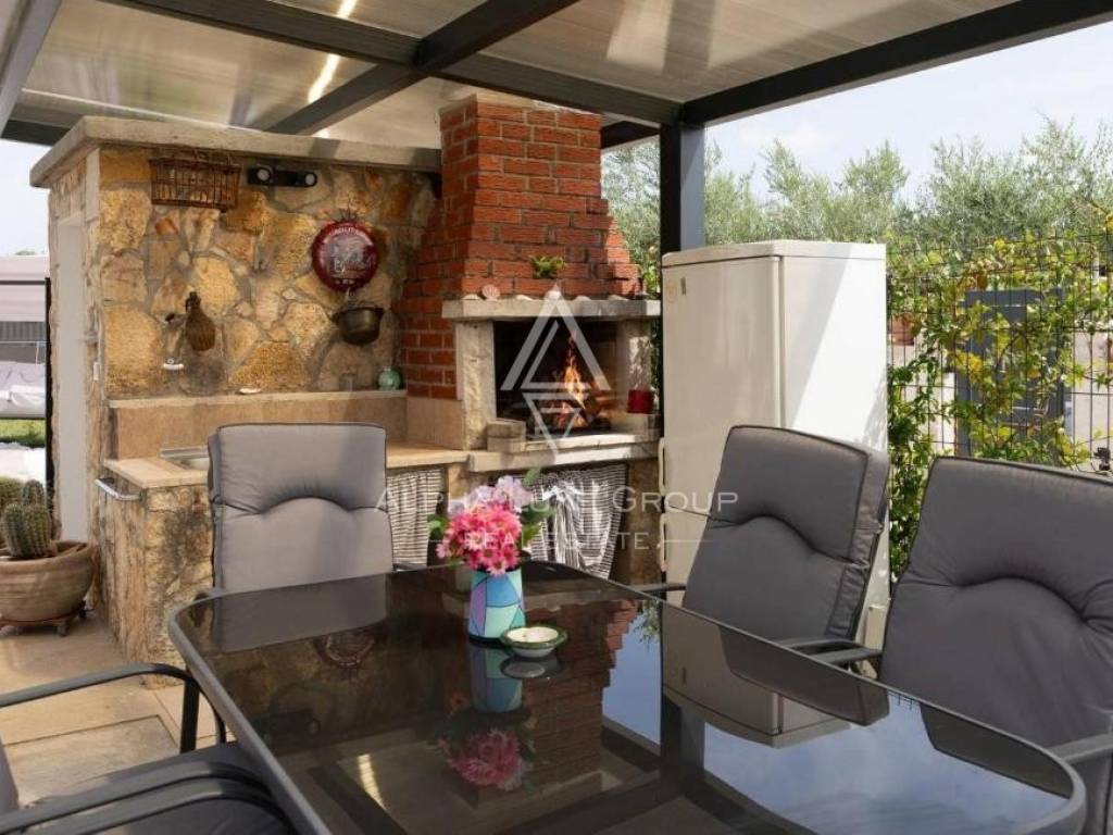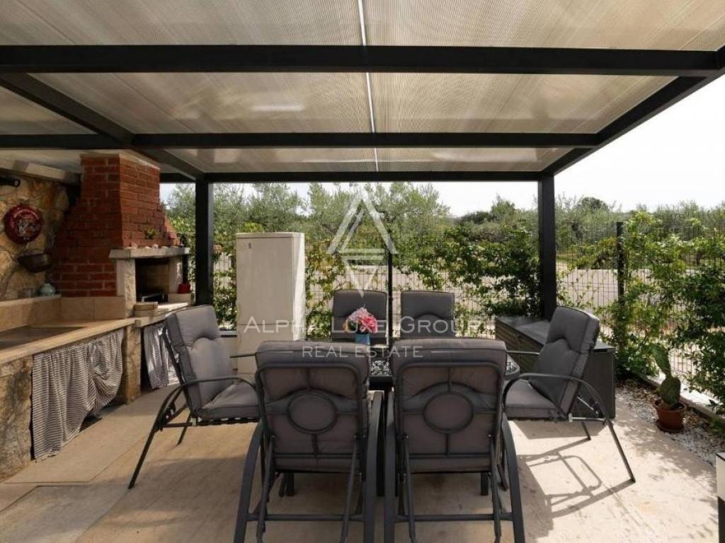 Kuća je smještena na zemljištu većem od 3000 m² koje pruža osjećaj potpune slobode i privatnosti. Posebnu vrijednost daje lijepo održavan maslinik, kao i uređena okućnica s bazenom i sunčalištem – savršeno mjesto za uživanje u toplim danima i druženje s obitelji i prijateljima. Na imanju se nalaze i tri dodatna gospodarska objekta koji mogu služiti za spremište, radionicu ili druge namjene prema željama budućih vlasnika.