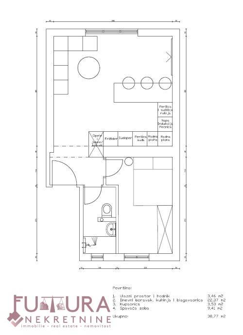 Sastoji se od jedne spavaće sobe, kuhinje s blagovaonicom i dnevnim boravkom te kupaonice.