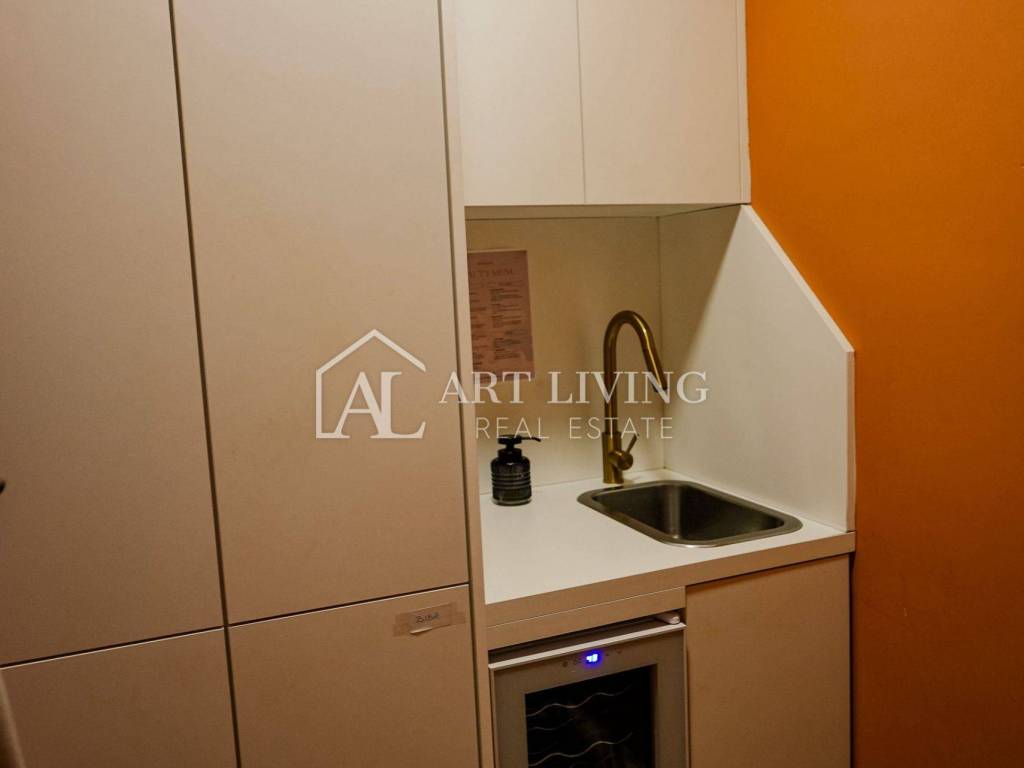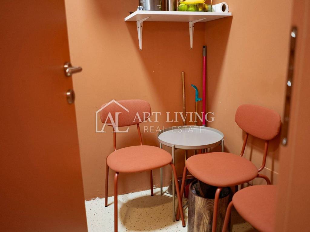 U sklopu prostora nalazi se i mala kuhinja/ostava za djelatnike s ugradbenim hladnjakom, sudoperom, ormarićima i prostorom za odmor. Kuhinja je također izrađena po mjeri kako bi se savršeno uklopila u dizajn prostora.