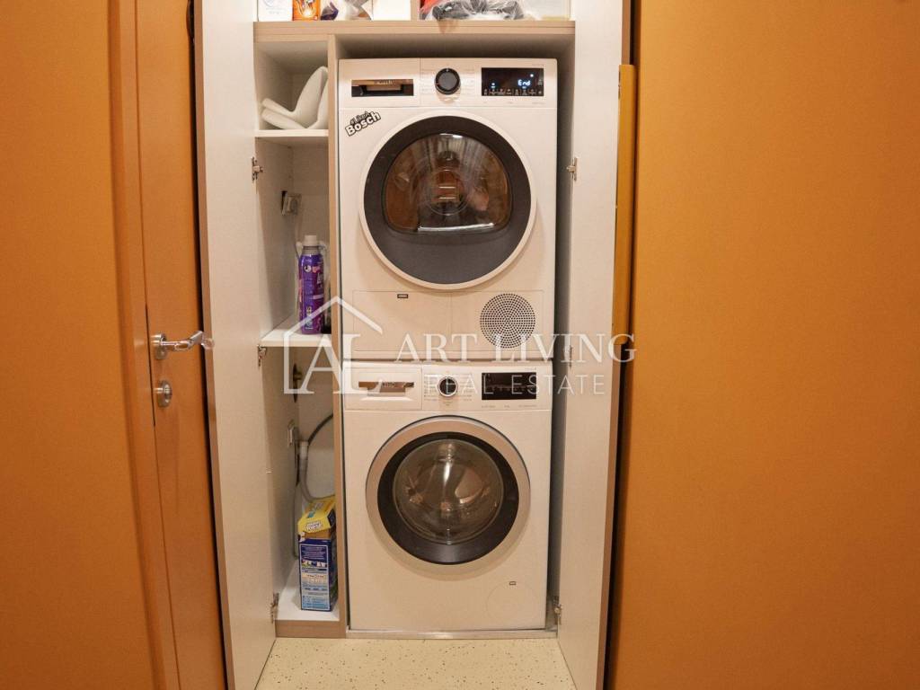 Hodnik je vizualno čist i simetričan, a na njegovom kraju nalazi se veliko ogledalo od poda do stropa koje dodatno proširuje prostor. Iza ogledala se diskretno nalazi vešeraj s perilicom i sušilicom rublja te prostor za sredstva za čišćenje.