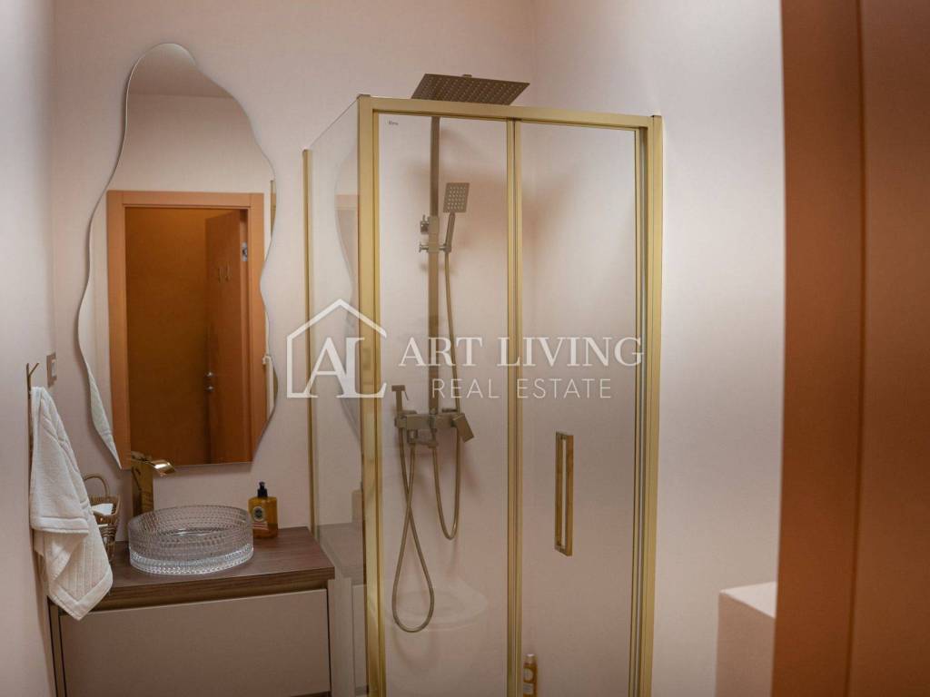 Kupatilo je moderno uređeno i opremljeno tuš kabinom sa zlatnim profilima i zlatnim tušem, osvijetljenim dizajnerskim ogledalom, komodom rađenom po mjeri sa staklenim umivaonikom i zlatnom slavinom te ugradbenim WC-om (Geberit).