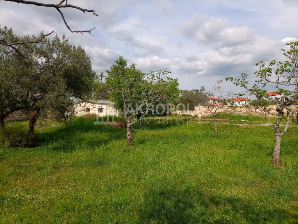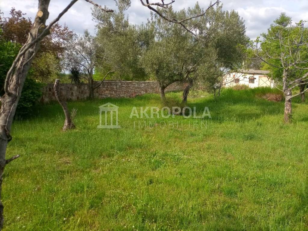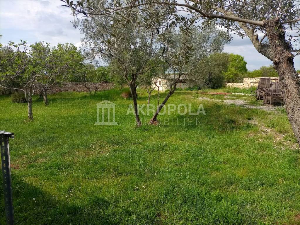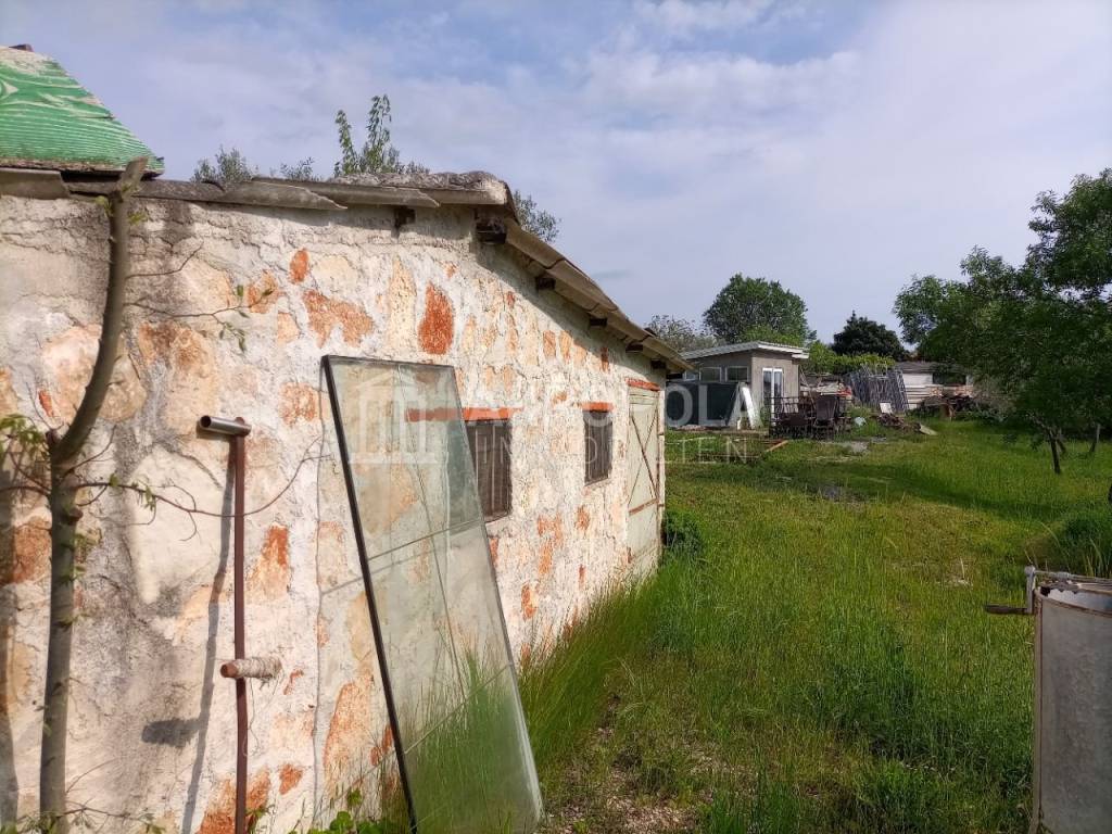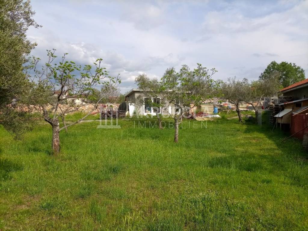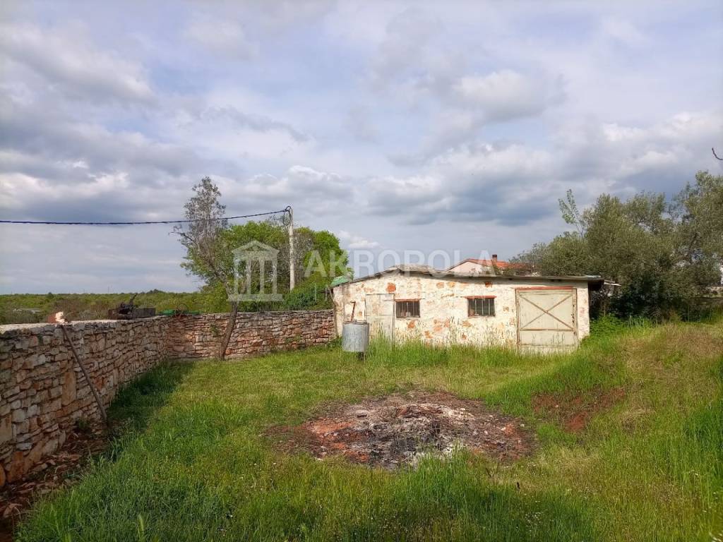 Peroj, građevinsko zemljište 950 m2 + put 58 m2. Legalizirana pomoćna stambena građevina od 30 m2 + 15 m2 studio (soba sa kupaonom). Idejni projekt za gradnju kuće. Struja i voda dovedeni na parcelu( nisu plaćeni priključci), septička na parceli. Mirna lokacija , blizina mora i plaža cca 600 m.