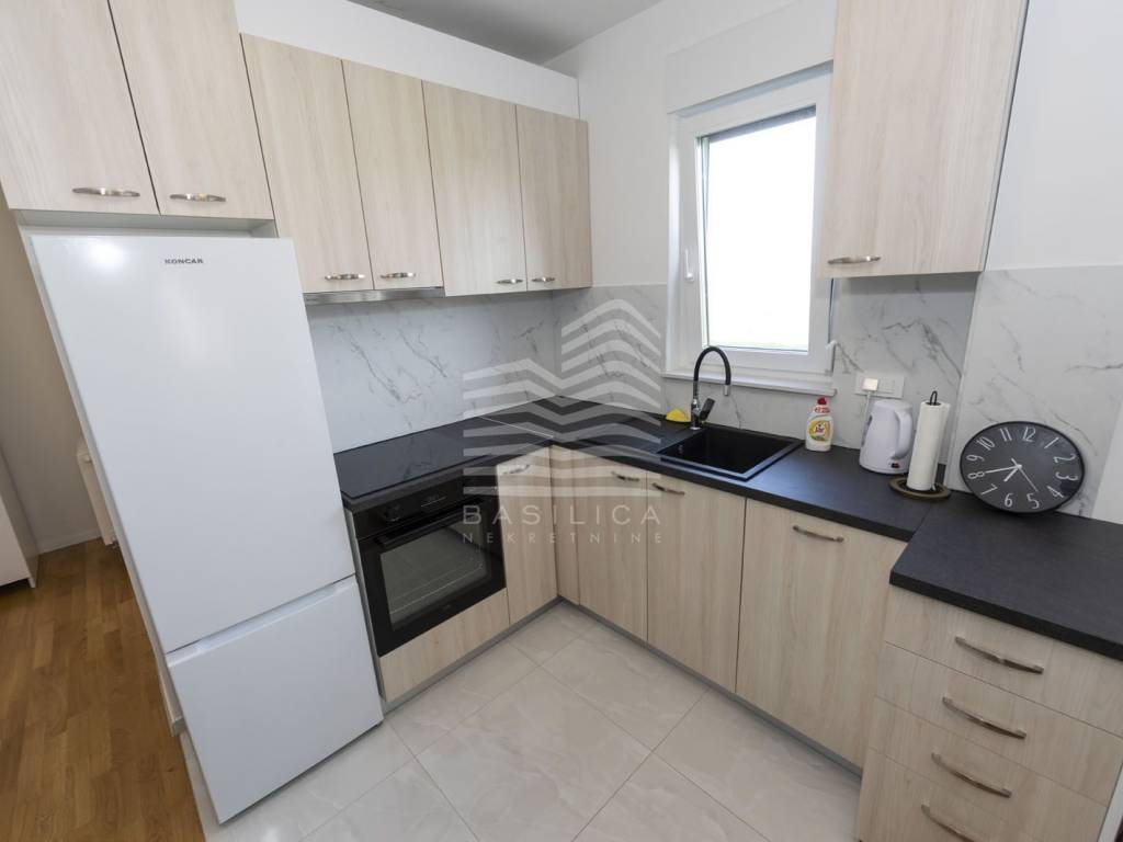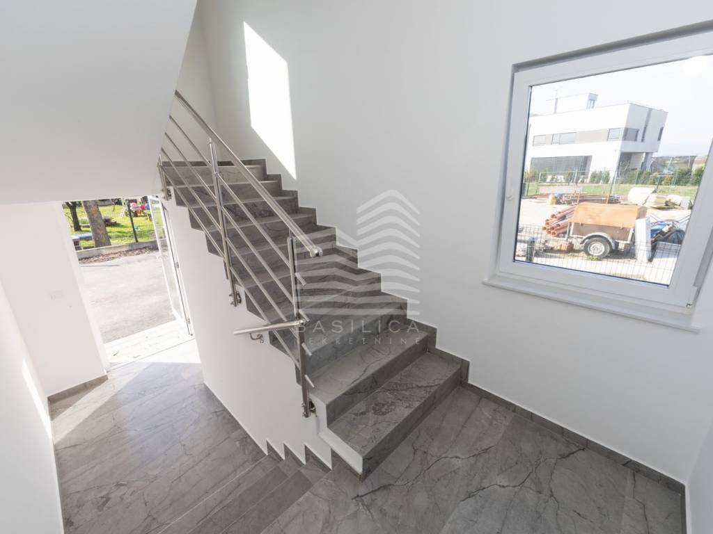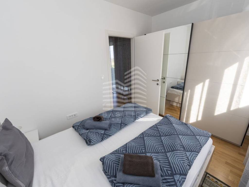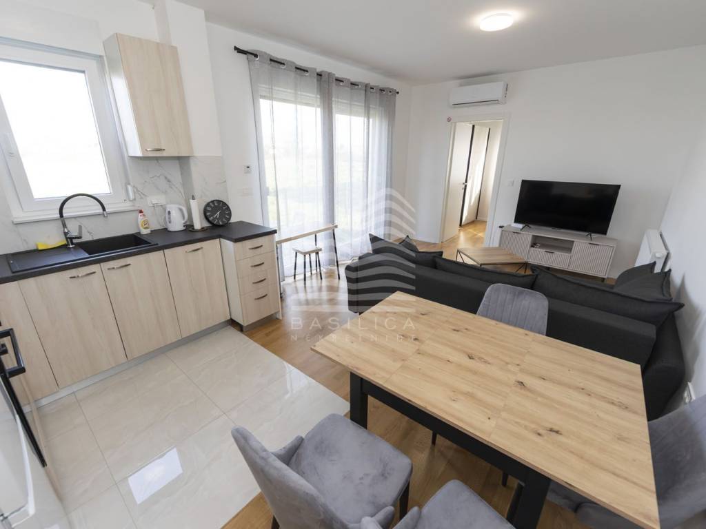 Veliko Polje / Velika Mlaka - stan u novogradnji, nalazi se u ulici Kovači, novonamješten i opremljen stan. Zgrada se sastoji od visokog prizemlja i 2 kata. Samo jedan stan po etaži. Nalazi se u visokom prizemlju, dvosoban, te se sastoji od ulaznog hodnika, dnevnog boravka sa kuhinjom i blagovaonicom, kupaonice i spavaće sobe, stambene površine 40,52m2, te jednog vanjskog parkirnog mjesta od 17,1m2 (obračunski 4,28m2), i veliko vrta koji pripada samo tom stanu (92,65m2 - obračunski 9,27m2). Ukupna obračunska površina je 54,07m2.