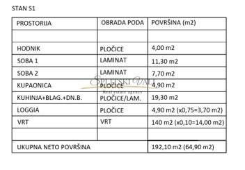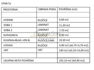 Na prodaju novi stambeni projekt s ukupno osam stanova, smješten u mirnom dijelu Kaštel Novi . Projekt se izvodi prema suvremenim standardima i provjerenim materijalima. Stan S1 nalazi se u prizemlju te se sastoji od ulaznog prostora, kuhinje s blagovaonicom, dnevnog boravka, dvije spavaće sobe, kupaonice i loggie, a dodatnu vrijednost pruža prostrani vrt koji pripada stanu i idealan je za svakodnevnu upotrebu.