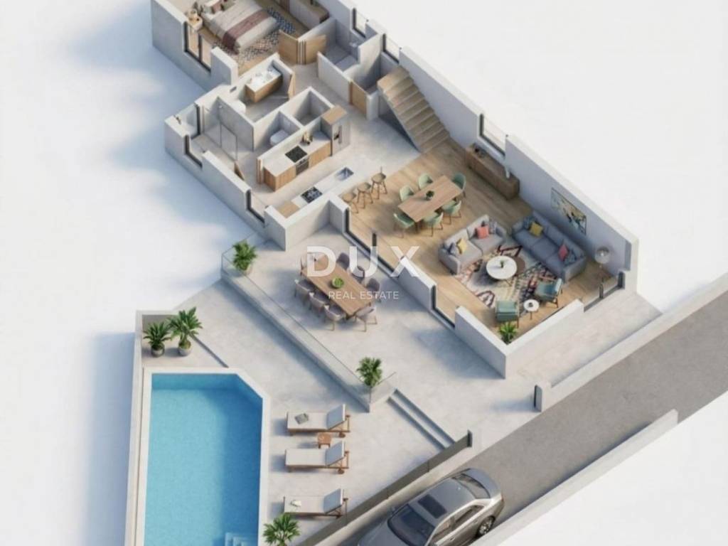 Poseban naglasak stavljen je na vanjski prostor koji uključuje natkrivenu terasu, sunčalište i preljevni bazen dimenzija 4.5 x 8.5 m idealno za uživanje ili povećanje atraktivnosti kod turističkog najma.